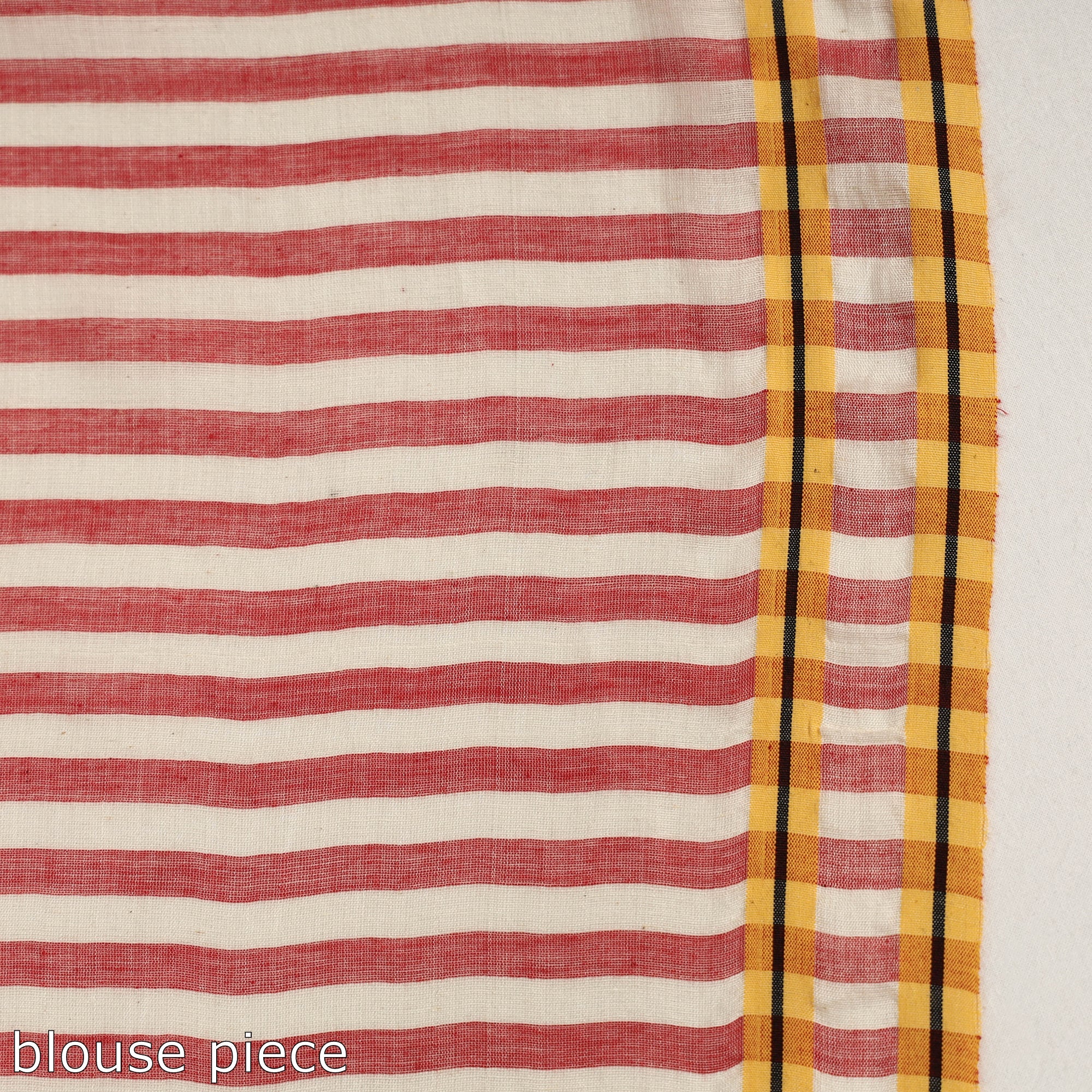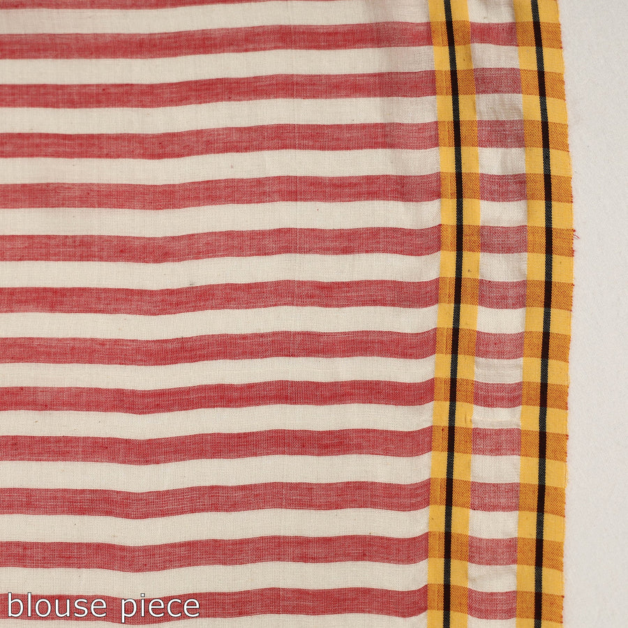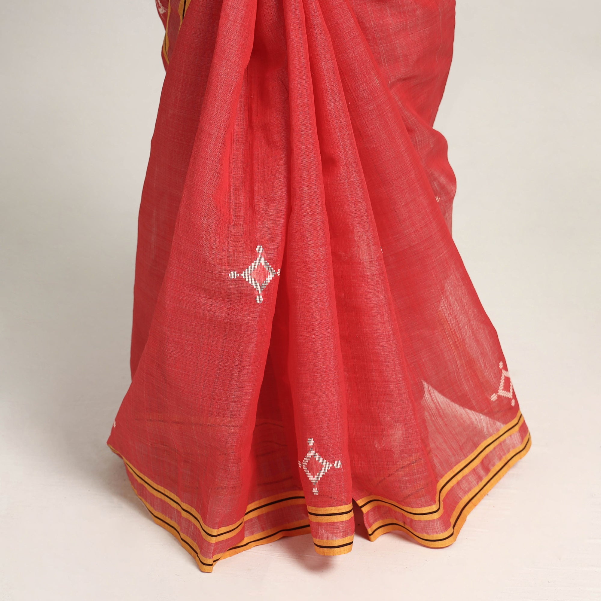 Jinali is a rose-red silk-cotton blend 52 buti saree, embellished with 52 motifs in kora (natural white) across its six meter length. It has a one meter blouse with stripes in rose-red and kora.