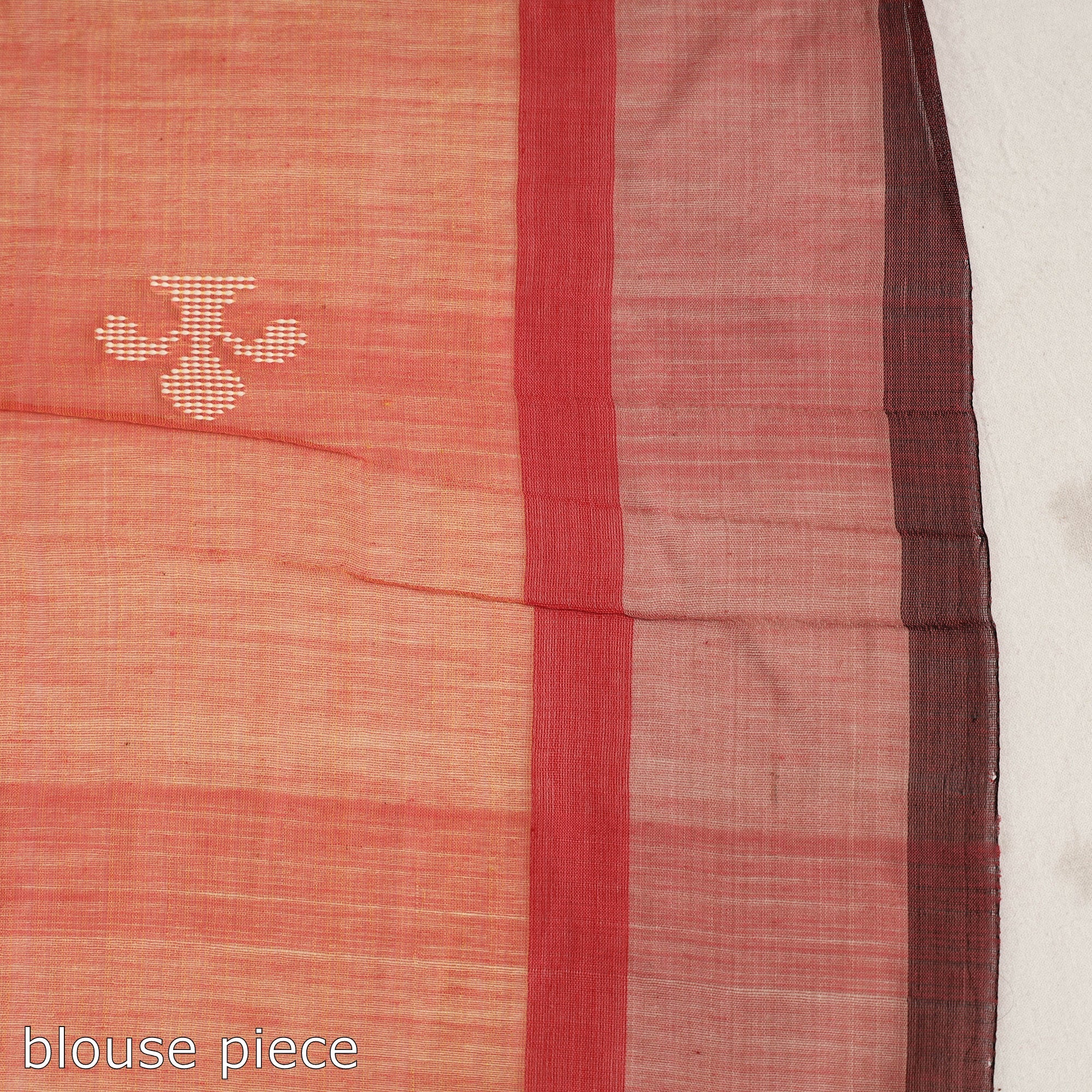 | Material | Pink base handspun & handwooven tussar silk-cotton saree of six meters with extra weft white motifs along with red & black border without blouse. Tussar silk is known for its unique texture, sheen of silk and feel of cotton A perfect blend of both worlds completely suitable for all weathers. |
