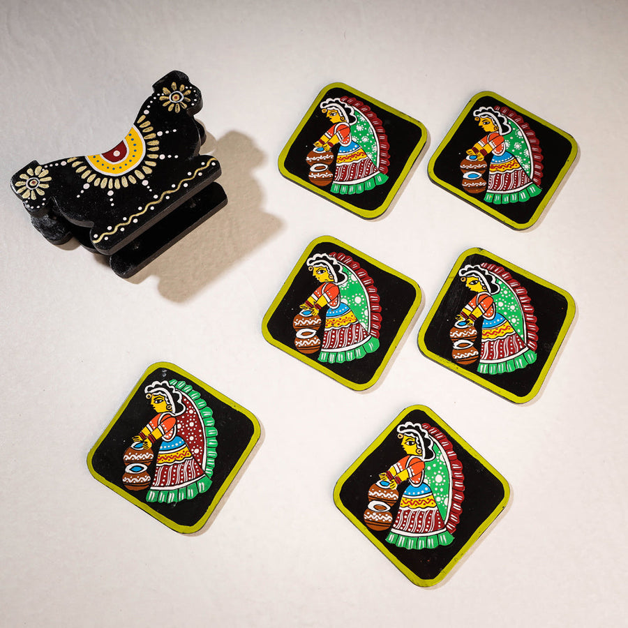 Beautifully handcrafted coaster set with stand, made of MDF wood with tikuli hand painted miniature painting that depicts a regular day in the life of village women. (oil colours used)