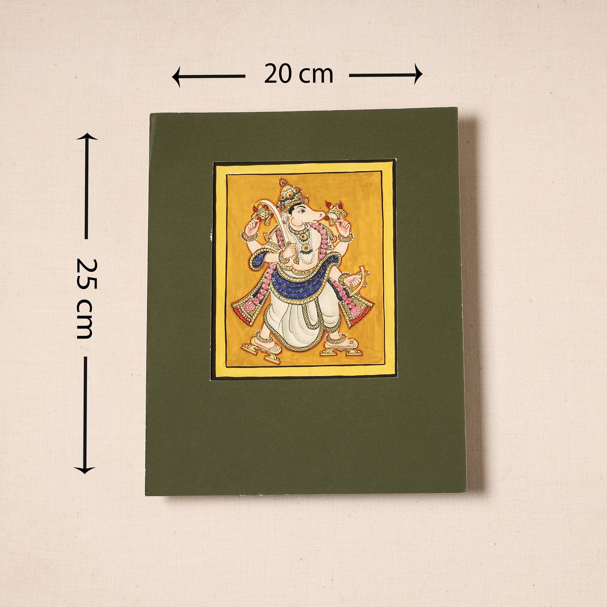 Traditional hand-painted painting with natural colours on archival paper with hard paper mount. Mount can be changed as required. This classical South Indian art comes from Mysore from the family of JS Sridhar Rao. A wonderful painting for the discerning decor aficionado or a gift for an art lover. These are priceless collectibles. Mysore painting is an important form of classical South Indian painting that originated in and around the town of Mysore in Karnataka. Mysore paintings are known for their elegance, muted colours, and attention to detail. The themes for most of these paintings are Hindu gods and goddesses and scenes from Hindu mythology. Mysore Paintings are characterised by delicate lines, intricate brush strokes, graceful delineation of figures and the discreet use of bright vegetable colours and lustrous gold leaf.