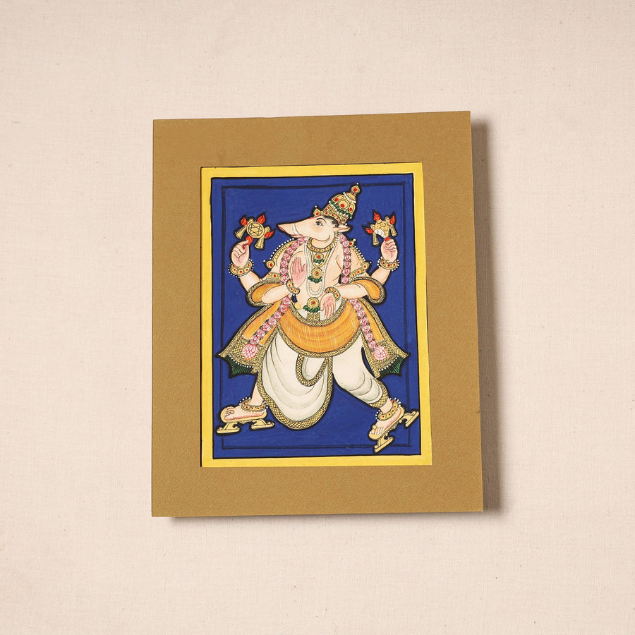 Traditional hand-painted painting with natural colours on archival paper with hard paper mount. Mount can be changed as required. This classical South Indian art comes from Mysore from the family of JS Sridhar Rao. A wonderful painting for the discerning decor aficionado or a gift for an art lover. These are priceless collectibles. Mysore painting is an important form of classical South Indian painting that originated in and around the town of Mysore in Karnataka. Mysore paintings are known for their elegance, muted colours, and attention to detail. The themes for most of these paintings are Hindu gods and goddesses and scenes from Hindu mythology. Mysore Paintings are characterised by delicate lines, intricate brush strokes, graceful delineation of figures and the discreet use of bright vegetable colours and lustrous gold leaf.