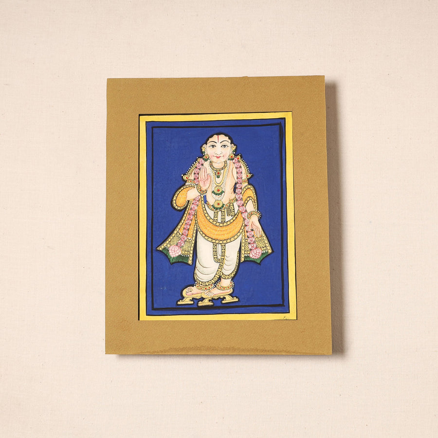 Traditional hand-painted painting with natural colours on archival paper with hard paper mount. Mount can be changed as required. This classical South Indian art comes from Mysore from the family of JS Sridhar Rao. A wonderful painting for the discerning decor aficionado or a gift for an art lover. These are priceless collectibles. Mysore painting is an important form of classical South Indian painting that originated in and around the town of Mysore in Karnataka. Mysore paintings are known for their elegance, muted colours, and attention to detail. The themes for most of these paintings are Hindu gods and goddesses and scenes from Hindu mythology. Mysore Paintings are characterised by delicate lines, intricate brush strokes, graceful delineation of figures and the discreet use of bright vegetable colours and lustrous gold leaf.