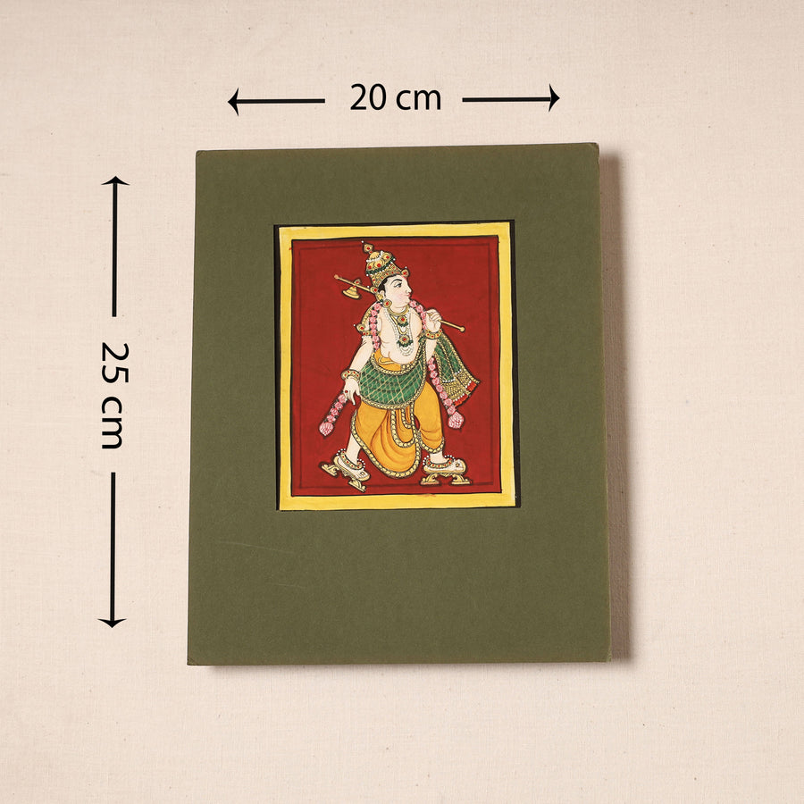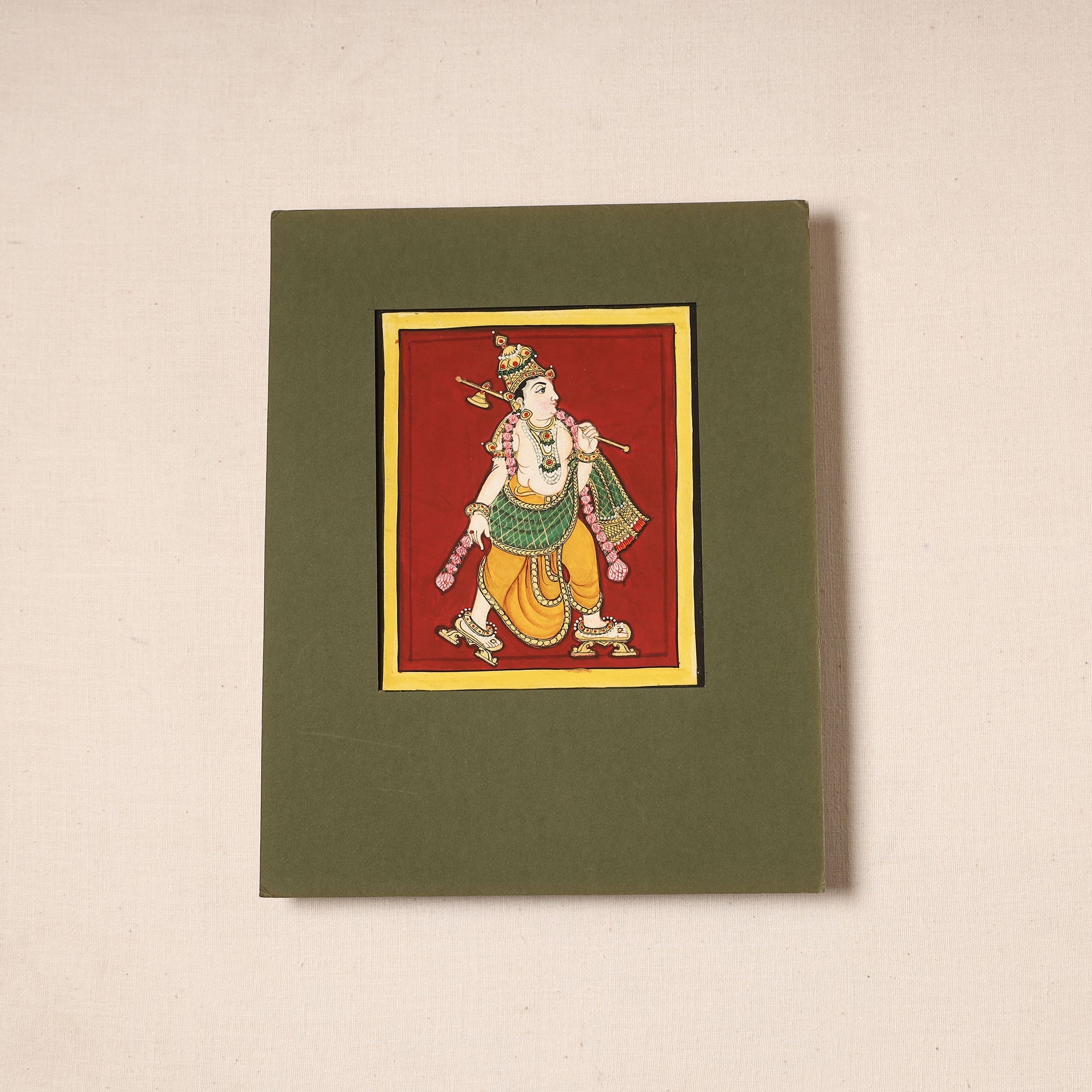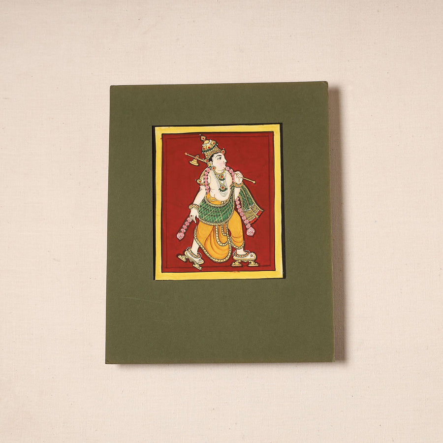 Traditional hand-painted painting with natural colours on archival paper with hard paper mount. Mount can be changed as required. This classical South Indian art comes from Mysore from the family of JS Sridhar Rao. A wonderful painting for the discerning decor aficionado or a gift for an art lover. These are priceless collectibles. Mysore painting is an important form of classical South Indian painting that originated in and around the town of Mysore in Karnataka. Mysore paintings are known for their elegance, muted colours, and attention to detail. The themes for most of these paintings are Hindu gods and goddesses and scenes from Hindu mythology. Mysore Paintings are characterised by delicate lines, intricate brush strokes, graceful delineation of figures and the discreet use of bright vegetable colours and lustrous gold leaf.