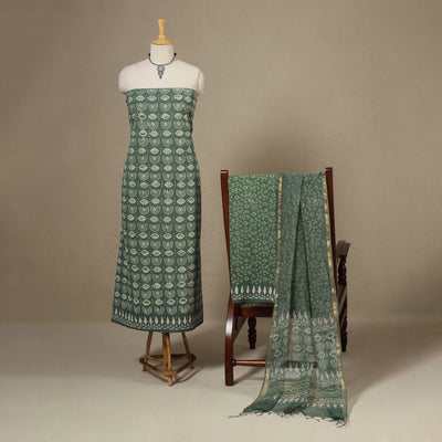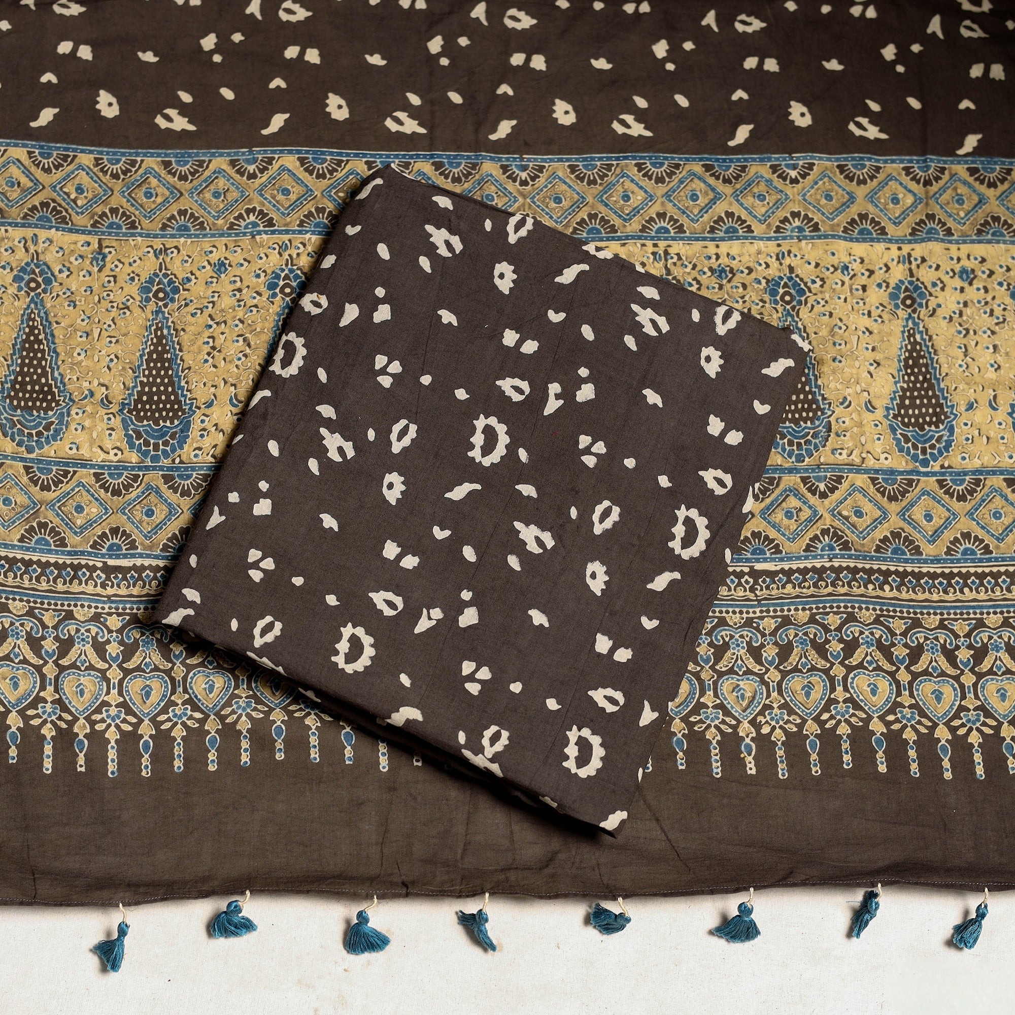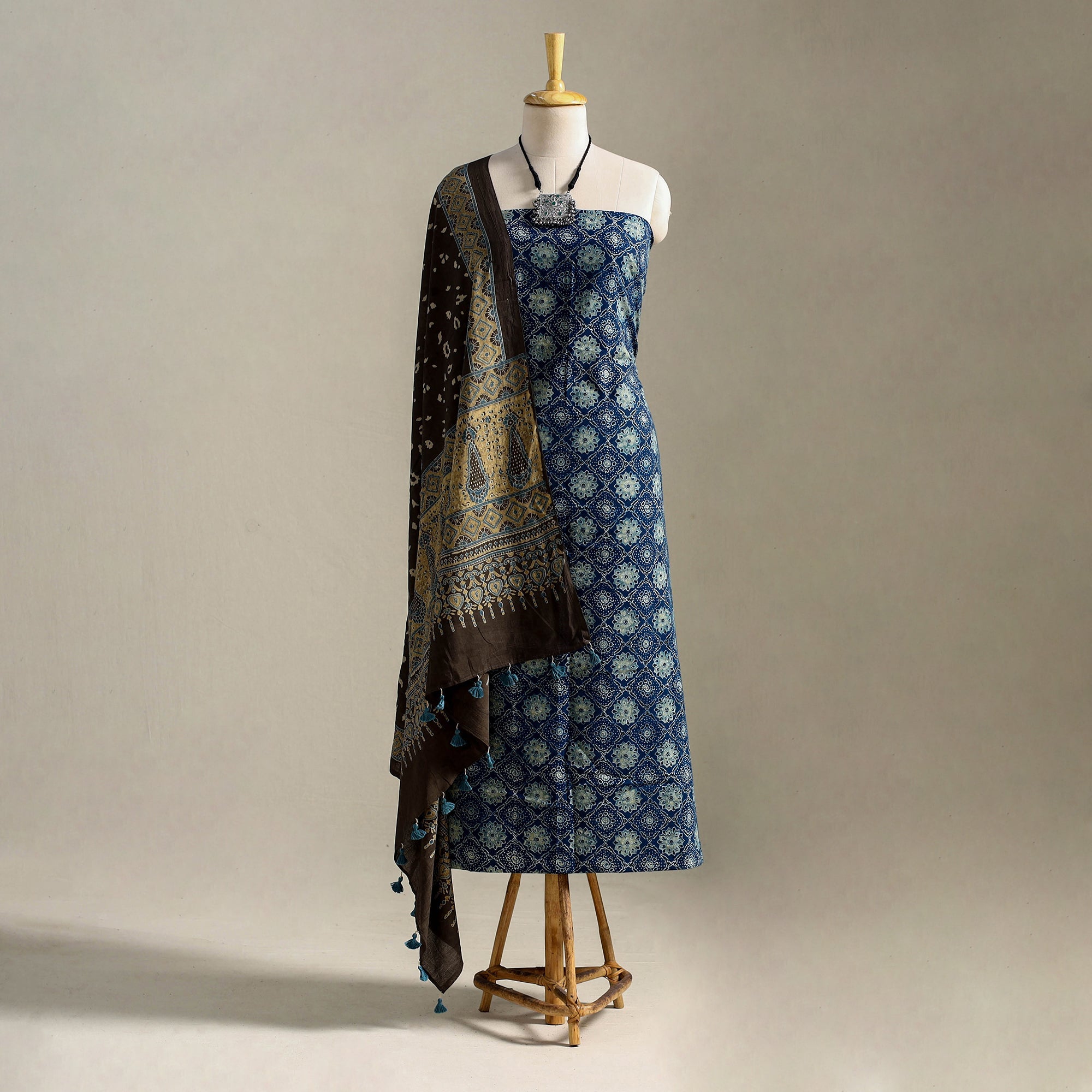Fine quality special blue ajrakh block printed cotton 3pc suit material set, made using natural dyes through traditional ajrakh technique of hand block printing by Sufiyan Khatri practised in Kutch region of Gujarat.