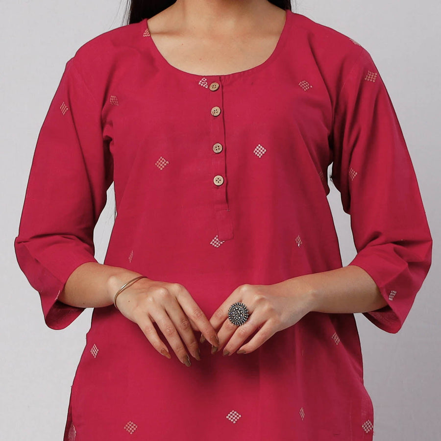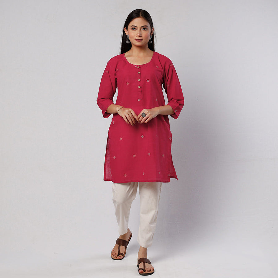 Look and feel beautiful in this uniquely designed jamdani handloom cotton short kurta with side pocket. This cotton kurta makes you comfortable with ease all day long. This kurta is perfect for your daily outing and for a special occasion. The base fabric for Jamdani is unbleached cotton yarn, and the design is woven using bleached cotton yarns so that a light-and-dark effect is created. The process is extremely time-consuming as it involves a tedious form of hand weaving. The making of Jamdani involves the supplementary weft technique along with the standard weft technique. With the latter, a base of sheer material is made on which thicker threads are used to create designs.