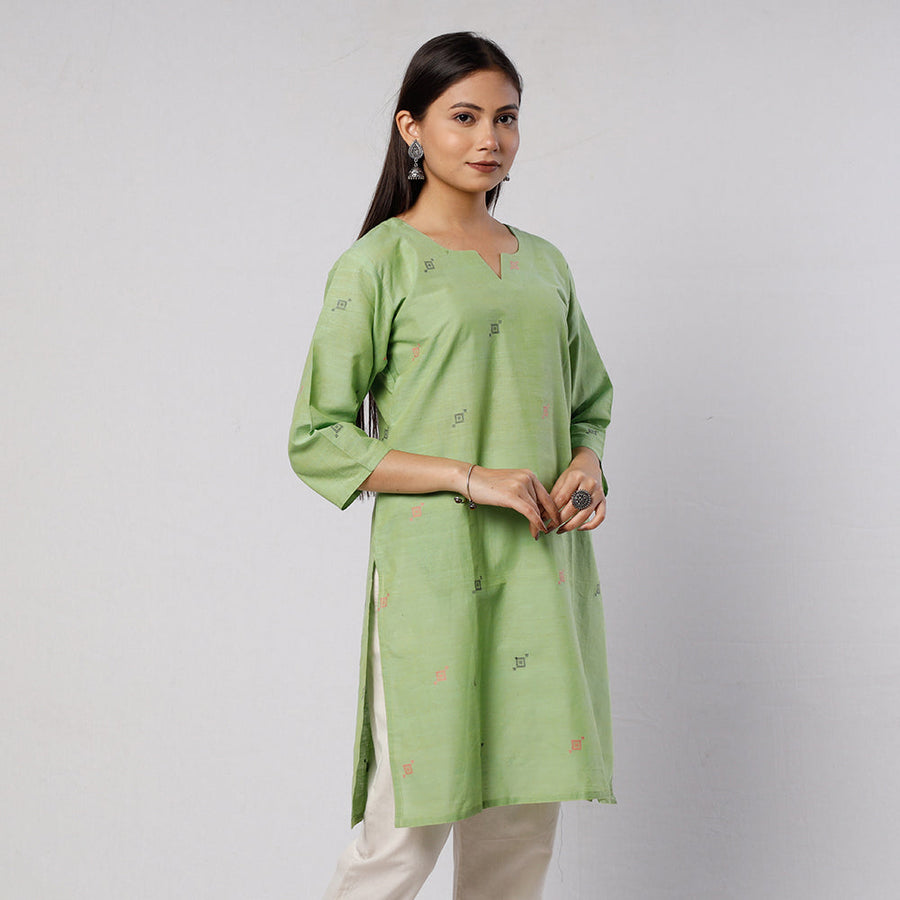 Look and feel beautiful in this uniquely designed jamdani handloom cotton short kurta with side pocket. This cotton kurta makes you comfortable with ease all day long. This kurta is perfect for your daily outing and for a special occasion. The base fabric for Jamdani is unbleached cotton yarn and the design is woven using bleached cotton yarns so that a light-and-dark effect is created. The process is extremely time consuming as it involves a tedious form of hand looming. The making of Jamdani involves the supplementary weft technique along with the standard weft technique. With the latter, the base sheer material is made on which thicker threads on used to create designs.