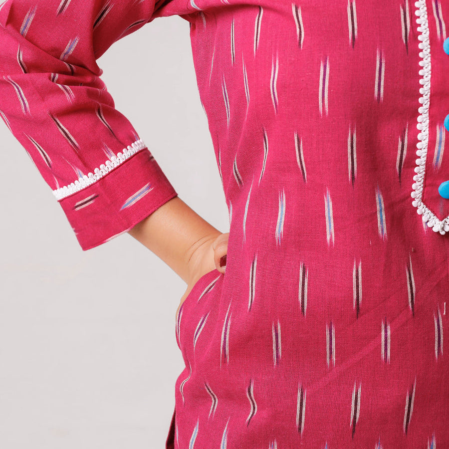 Look and feel beautiful in this uniquely designed ikat weave cotton long kurta with side pocket. This cotton kurta makes you comfortable with ease all day long. Ikat has lovely patterns in extremely beautiful colours. Ikat fabrics are world famous for their colours, texture and designs. Indian Ikat is one of the fabrics that is always admired by the fashion designers around the world.