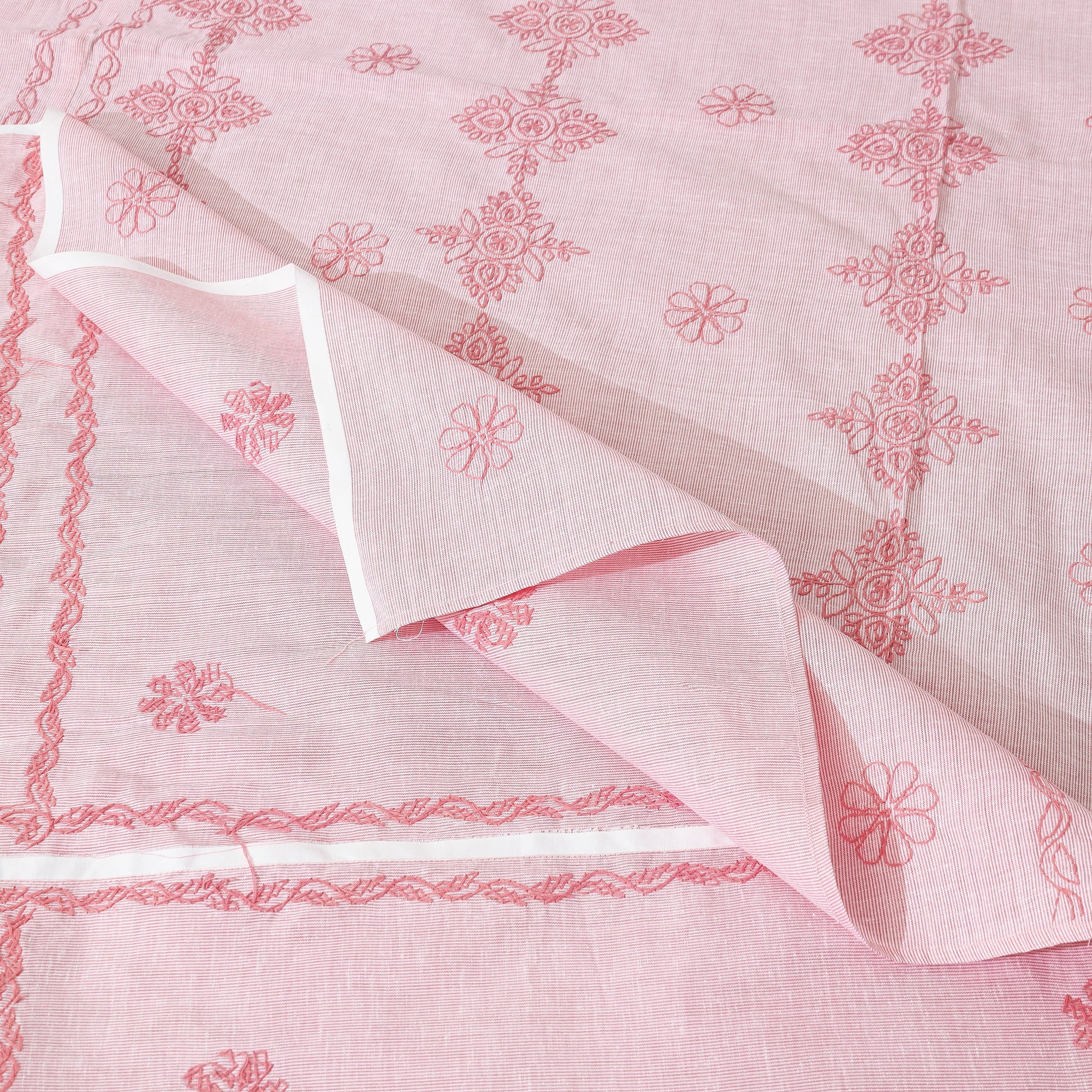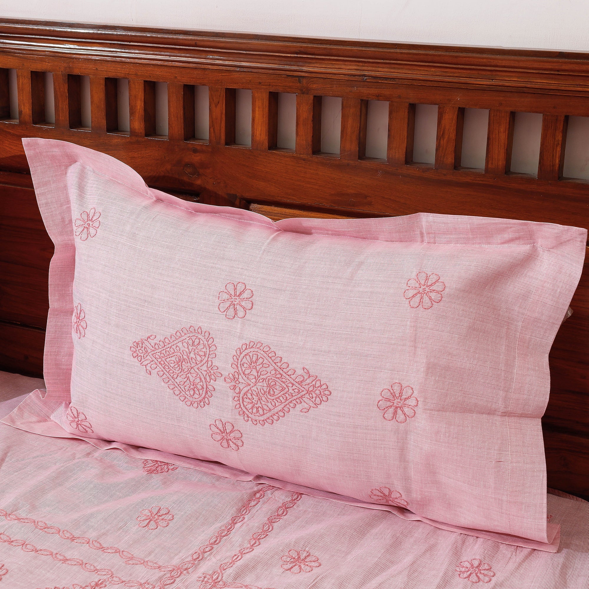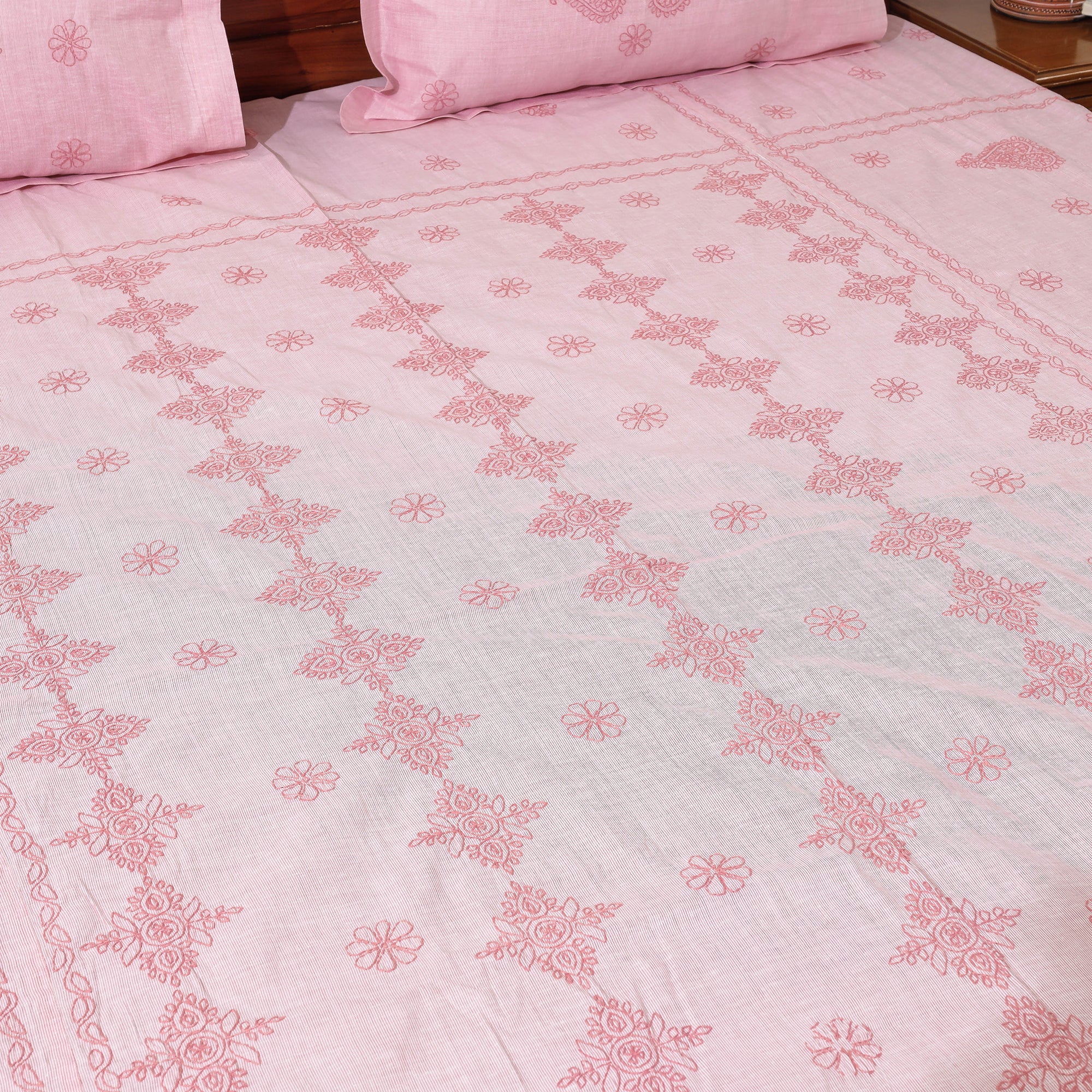 Intricate and artfully done lucknowi chikankari hand embroidered cotton bedcover with pillow covers. Chikankari is a traditional textile decorative from Lucknow. It is very delicate and intricate hand embroidery work where thread is embroidered on cool, pastel shades of light cotton garments.