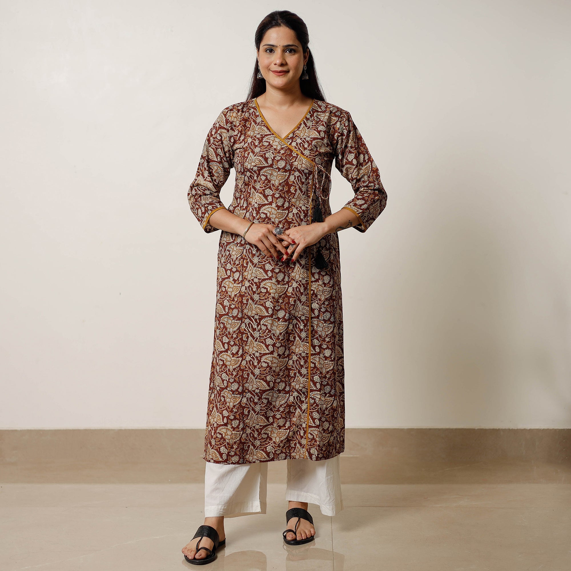 Look and feel beautiful in this uniquely designed brown bagru block print cotton long kurta with side pocket. This cotton kurta makes you comfortable with ease all day long. Made using natural dyes through traditional mud resist process by using hand carved wooden block practiced in Bagru, Rajasthan.