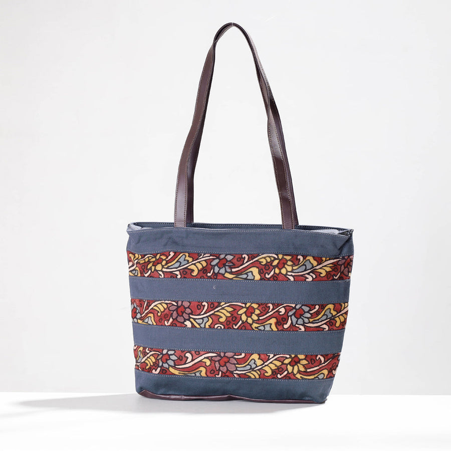 Blue handpainted kalamkari natural dyed cotton shoulder bag with rexine handle. It has one zipper pocket inside. This exquisite shoulder bag is created with handpainted kalamkari work, wherein the "Bamboo kalam" is used for free hand drawing of the subject and filling in the colours. It is entirely hand worked using natural colours.