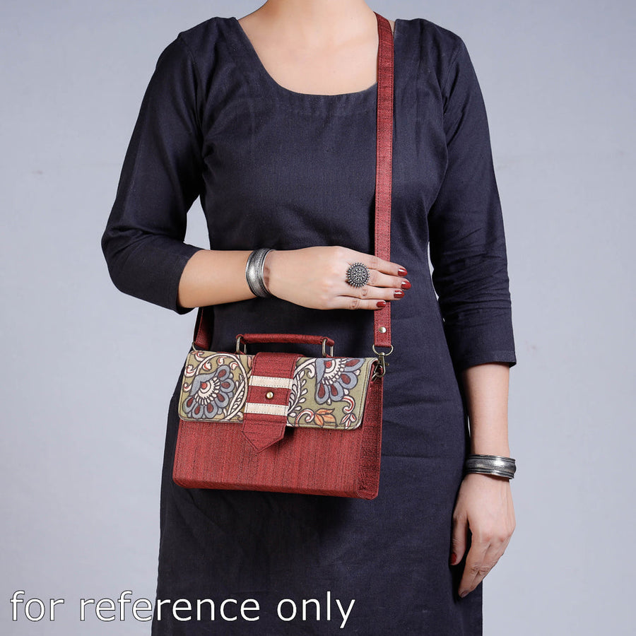 | Material | Blue handpainted kalamkari natural dyed ghicha silk sling bag with detachable sling. It has one zipper & one simple pocket inside. This exquisite sling bag is created with handpainted kalamkari work, wherein the "Bamboo kalam" is used for free hand drawing of the subject and filling in the colours. It is entirely hand worked using natural colours. |