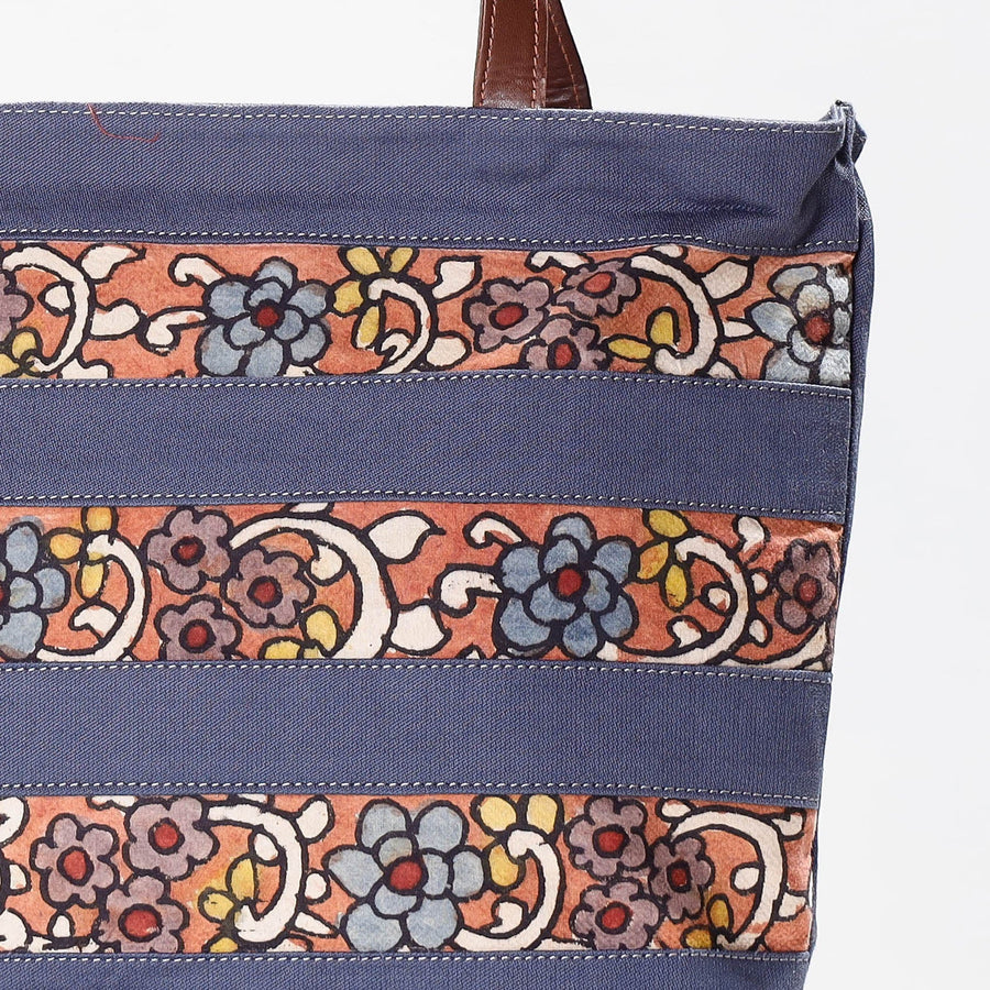 Blue handpainted kalamkari natural dyed cotton shoulder bag with rexine handle. It has one zipper pocket inside. This exquisite shoulder bag is created with handpainted kalamkari work, wherein the "Bamboo kalam" is used for free hand drawing of the subject and filling in the colours. It is entirely hand worked using natural colours.