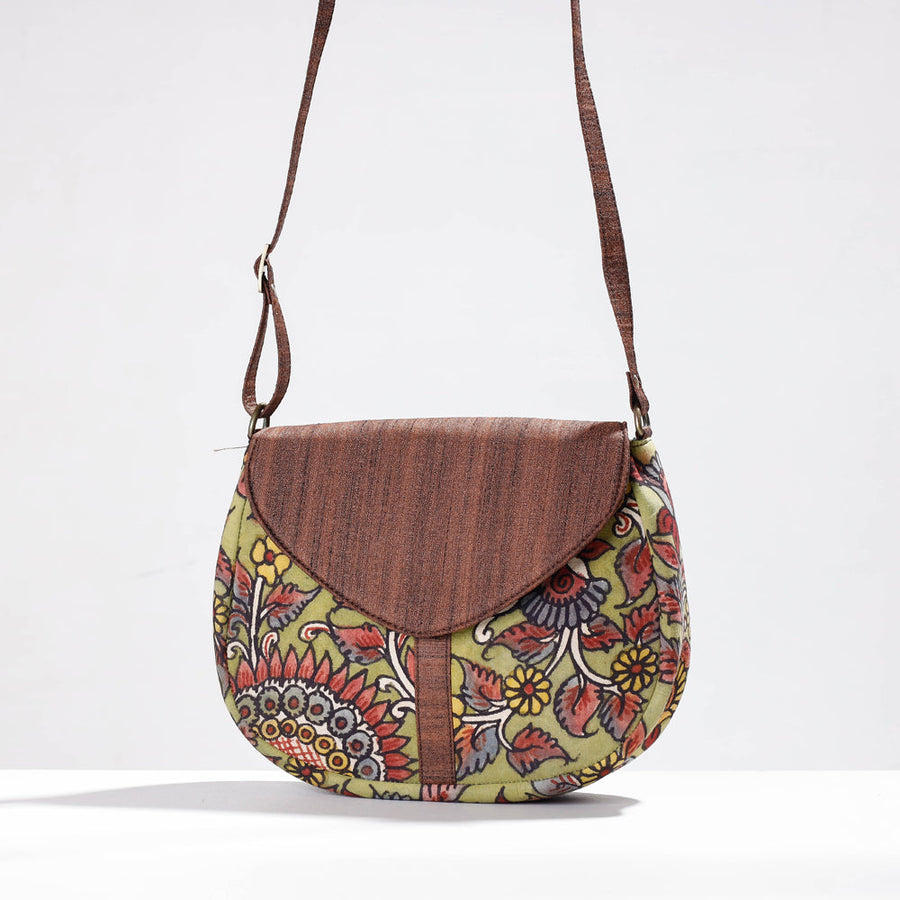 Green handpainted kalamkari natural dyed cotton sling bag with adjustable sling. It has one zipper pocket outside & one zipper pocket inside. This exquisite shoulder bag is created with handpainted kalamkari work, wherein the "Bamboo kalam" is used for free hand drawing of the subject and filling in the colours. It is entirely hand worked using natural colours.