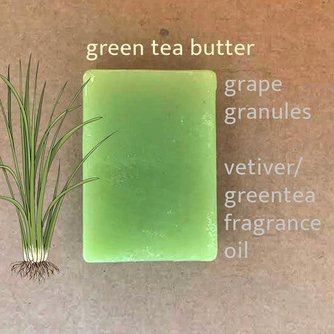 Handmade natural melt and pour green tea & vetiver soap. This bar is made using natural essential oils for refreshing bathing experience. Green tea butter is soft and supple, designed to soothe the skin and enhance its natural suppleness and healthy sheen. Ingredients : Cold-Pressed Coconut Oil, Distilled Water, Propylene Glycol, Glycerine, Sucrose, Betaine, Lye & Unrefined Green Tea Butter, Vetiver / Green Tea fragrance oil and Green Grape granules.