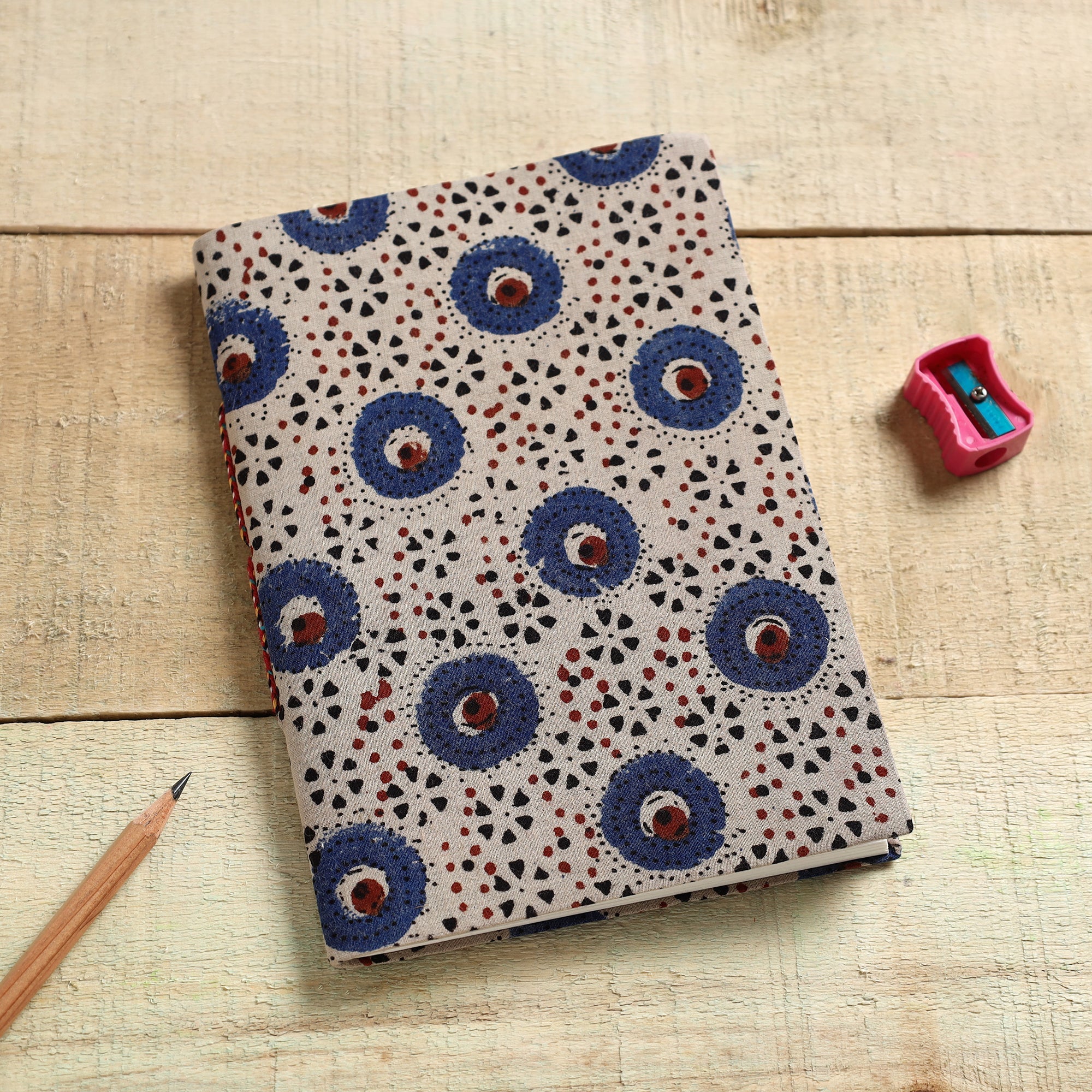 | Material | Beige ajrakh block printed fabric embellished hard bound cover notebook with hand made papers. This paper is made of cotton, paper and other natural fibre waste recycled in an eco-friendly manner without the use of chemicals. Hand made by master artisans who maintain careful personal attention to detail. They are highly skilled in a variety of bookbinding and handmade stationery manufacturing techniques. |