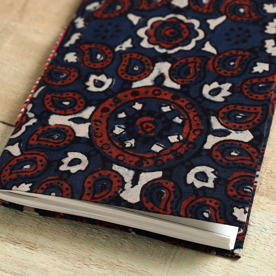| Material | Blue ajrakh block printed fabric embellished hard bound cover notebook with hand made papers. This paper is made of cotton, paper and other natural fibre waste recycled in an eco-friendly manner without the use of chemicals. Hand made by master artisans who maintain careful personal attention to detail. They are highly skilled in a variety of bookbinding and handmade stationery manufacturing techniques. |