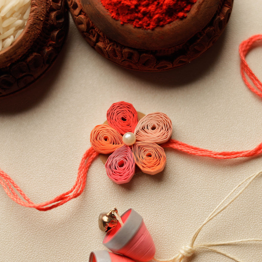 Paper quilling rakhi & lumba set handcrafted with colorful paper stripes for the very special khatta meetha bond between brother and sister. Quilling or paper filigree is an art form that involves the use of strips of paper that are rolled, shaped, and glued together to create decorative designs. The paper is rolled, looped, curled, twisted, and otherwise manipulated to create shapes that makeup designs to decorate greetings cards, pictures, boxes, etc. Quilling starts with rolling a strip of paper into a coil and then pinching the coil into shapes that can be glued together. There are advanced techniques and different sized paper that are used to create 3D miniatures, abstract art, flowers, and portraits among many things. By Purchasing Rakhi from iTokri you have proudly associated yourself with our artisan support initiative which brings happiness to more than 10000 families across India. Thanks so much!