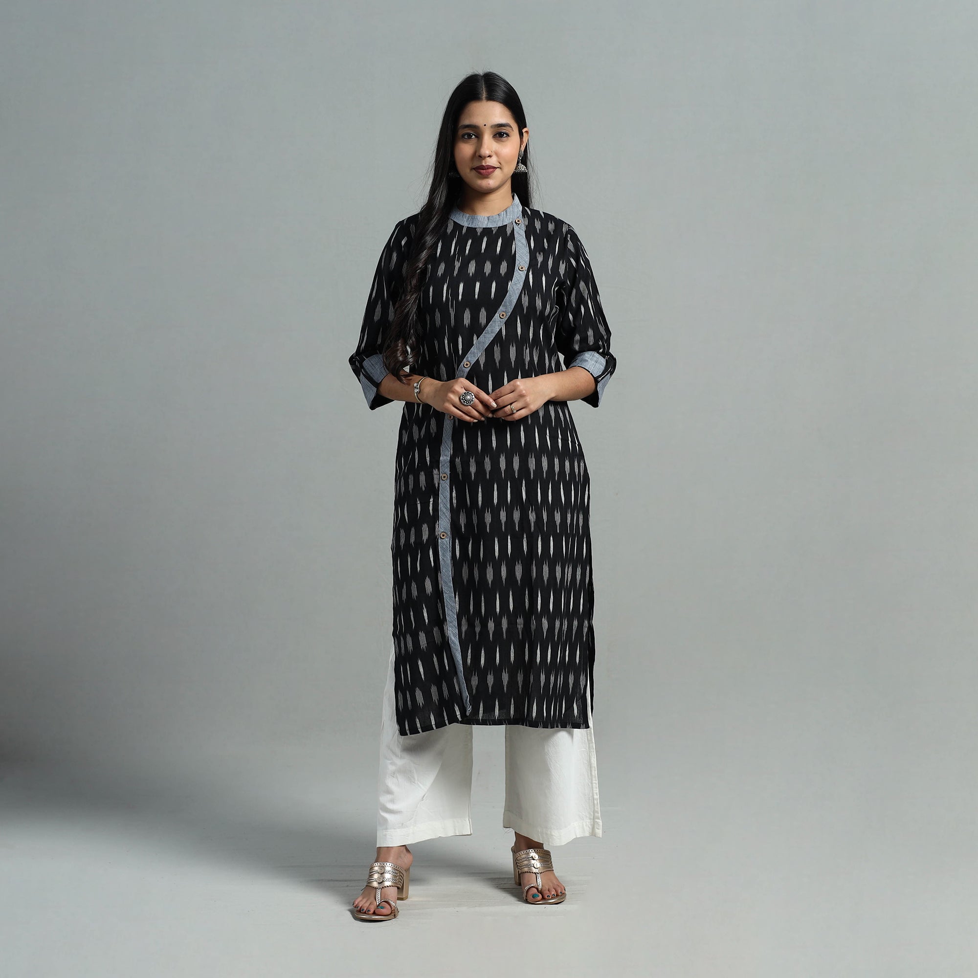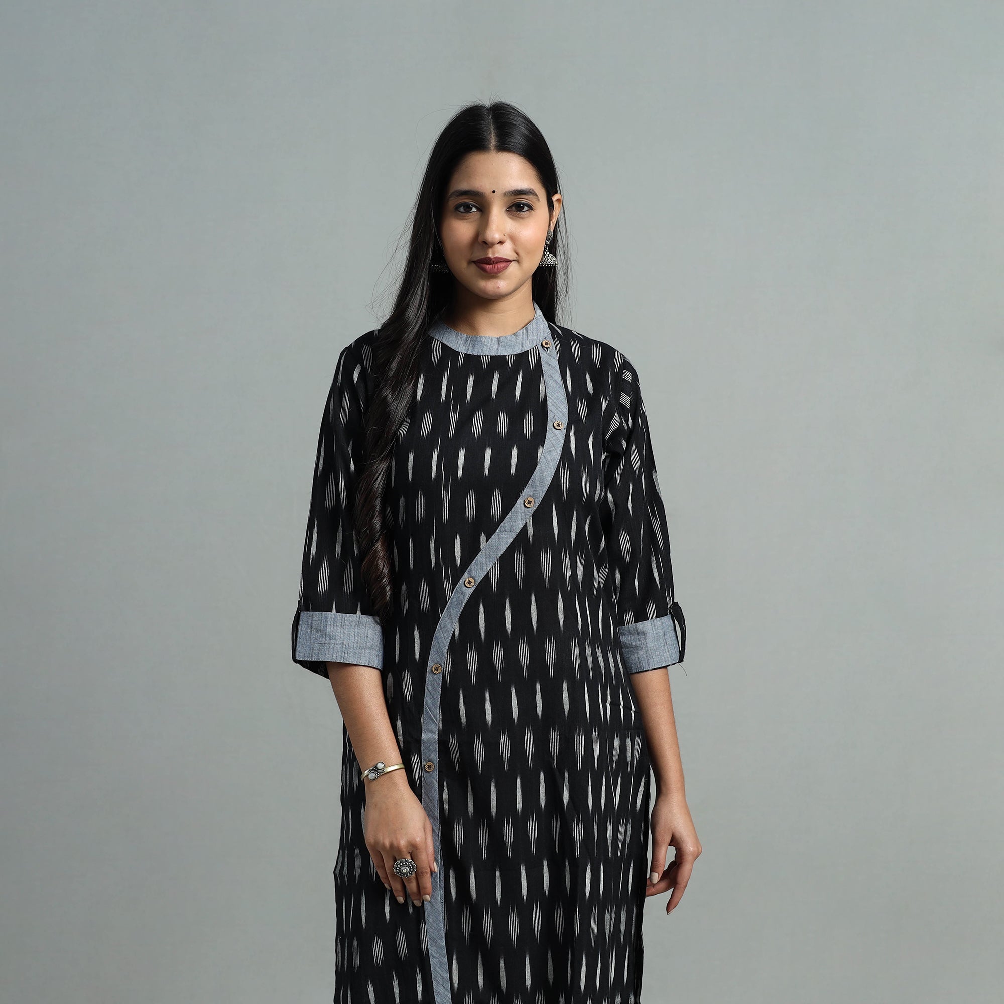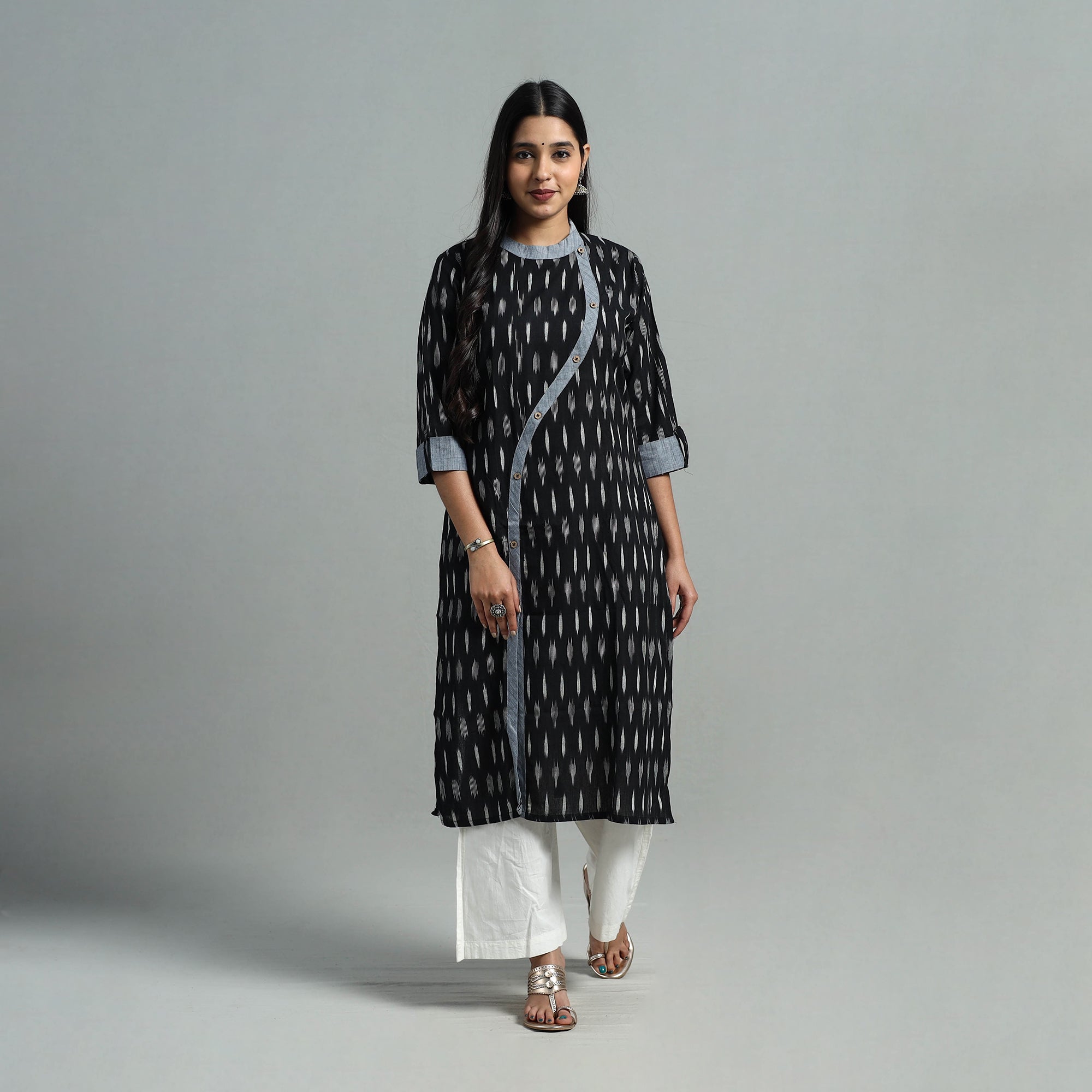 This angrakha cotton straight black pochampally ikat kurta features a stylish angrakha design, a practical side pocket for added convenience, and a chinese collar for a refined touch. Comfortable and versatile, this kurta is perfect for everyday wear or casual outings, blending traditional craftsmanship with modern functionality.
