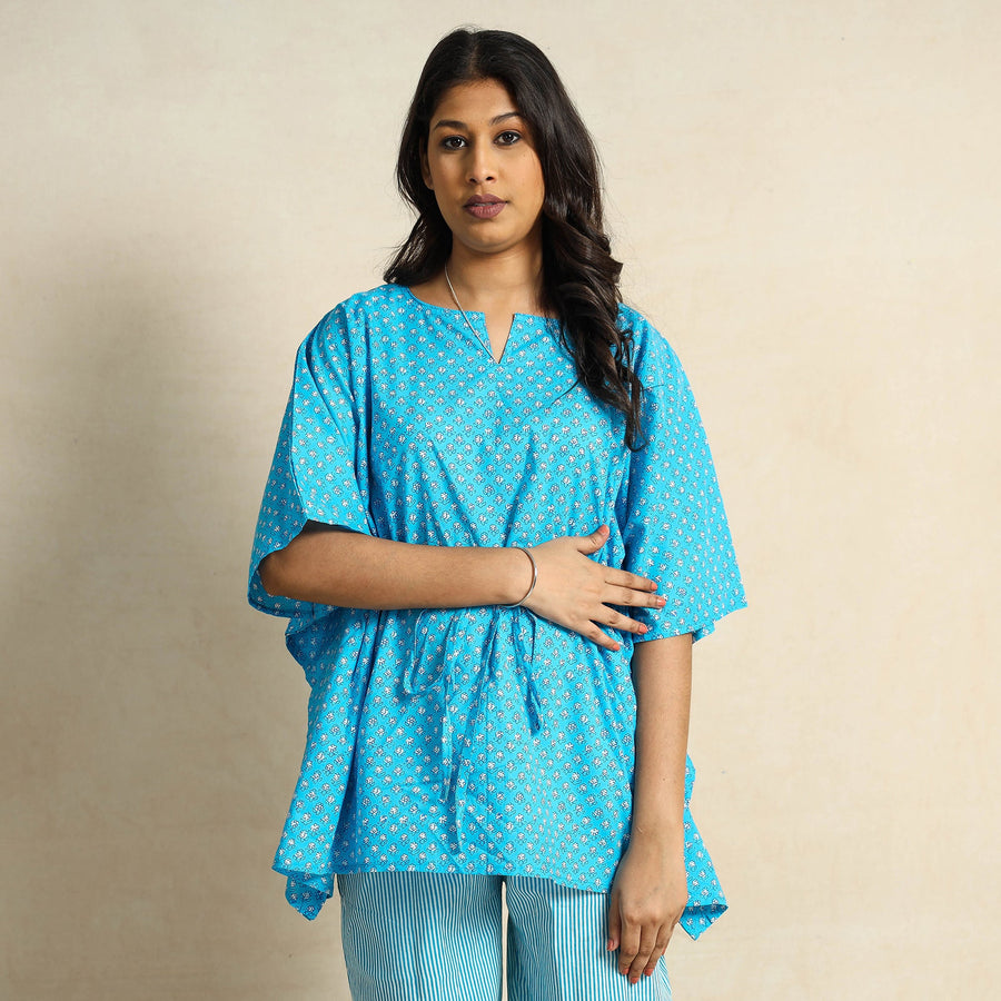 Fine quality blue hand block printed cotton night suit / loungewear. This suit consists of a short tie-up waist cotton Kaftan paired with elasticated pyjama. These soft cotton night suits are enhanced by beautiful hand prints. This outfit allow you to move and sleep with ease and comfort and stylish enough to lounge in! The drawstring elasticated tie up waist will give you the freedom to customize the fit to suit your unique shape.