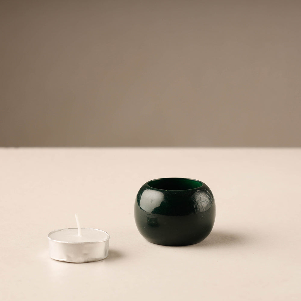 Handmade traditional channapatna wooden tealight candle holders from Andhra Pradesh. These handmade wooden tealight candle holders will surely look very classy on your tables. This tealight candle holder is hand painted with natural dyes. Colors are obtained naturally Yellow colour from turmeric, Red colour kum-kum base, Green colour vegetable leaf dye, Orange colour from Saffron dye. This product is a lacware craft which is made of lac, a naturally available resin. It is non-toxic and chemical free.
