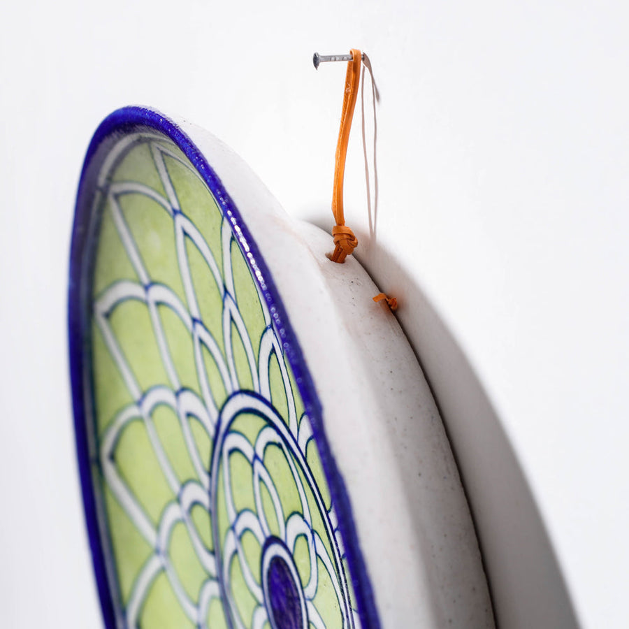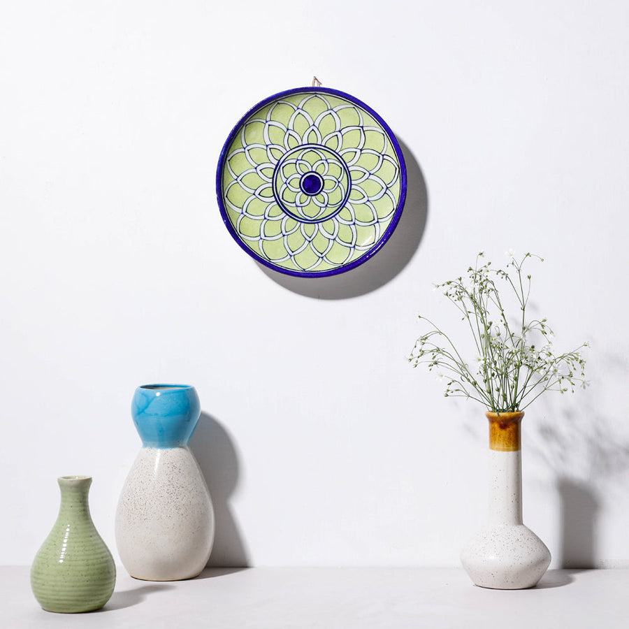 Green handcrafted blue pottery ceramic plate/wall frame. This plate/wall frame bring a dash of classical appeal to any wall decor ensemble in your home. A unique wall accent piece for your living room or bedroom it will look stunning on its own or mixed with several other designs.