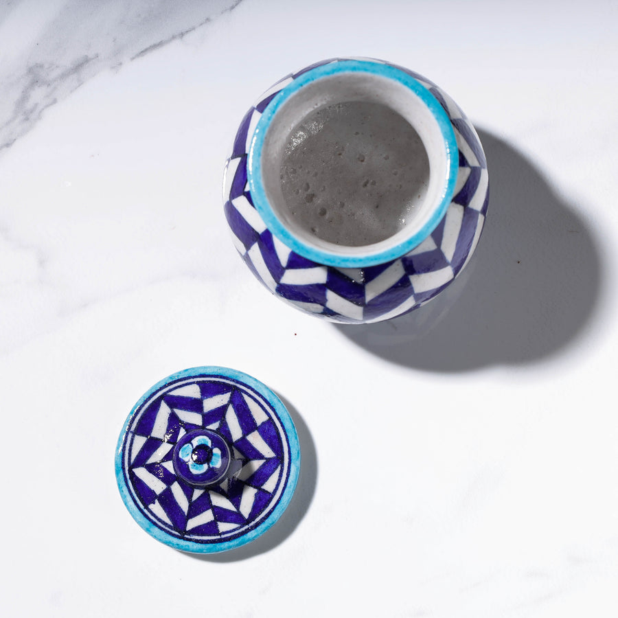 Blue handcrafted blue pottery ceramic barni/storage jar with lid. Store your favourite pickle just like the old days and in the traditional style in these ceramic barni. This is also an excellent festival gifting option.