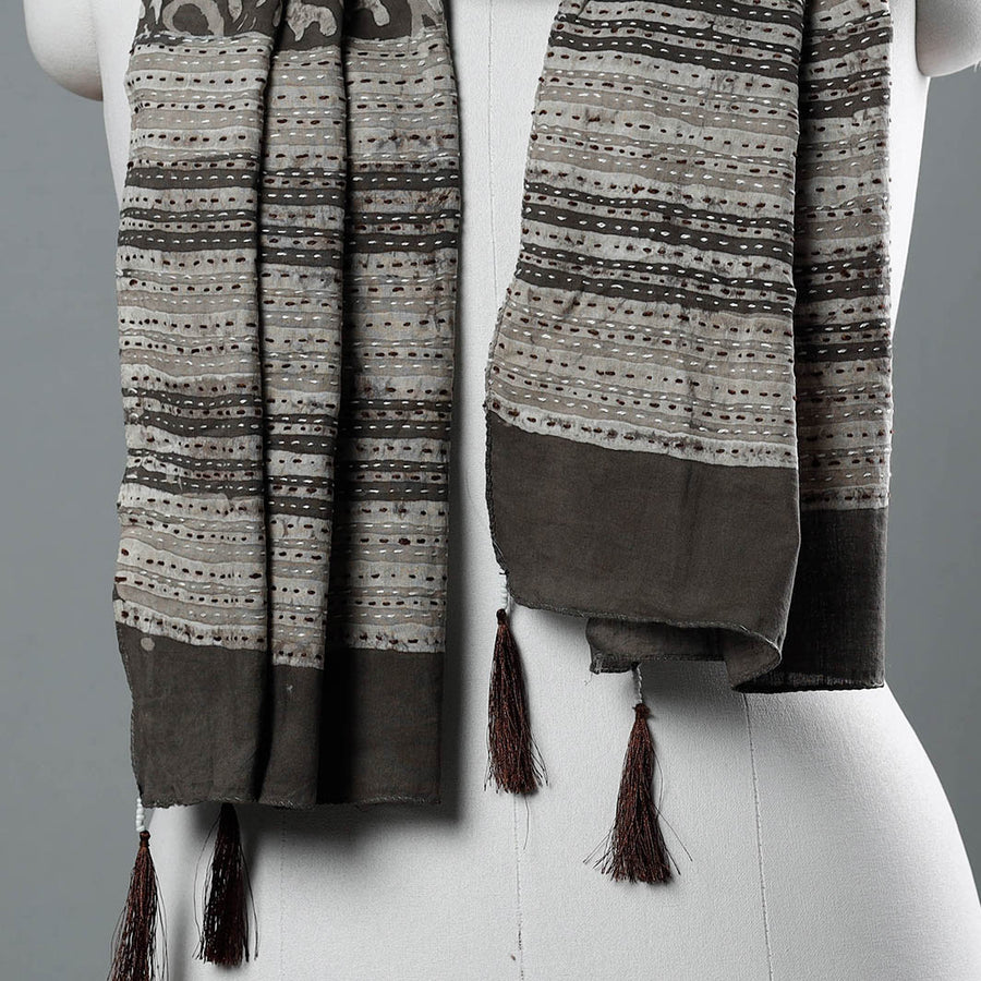 Fine quality bagru hand block printed tagai work pure cotton stole with tassels, made using natural dyes through traditional mud resist process by using hand carved wooden block practiced in Bagru, Rajasthan. These stoles are designed with running patterns & has been hand embroidered using traditional craft technique of Tagai.