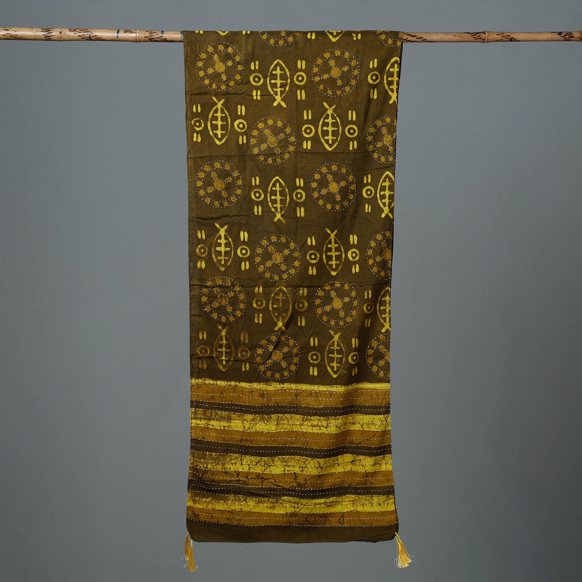 Fine quality bagru hand block printed tagai work pure cotton stole with tassels, made using natural dyes through traditional mud resist process by using hand carved wooden block practiced in Bagru, Rajasthan. These stoles are designed with running patterns & has been hand embroidered using traditional craft technique of Tagai.