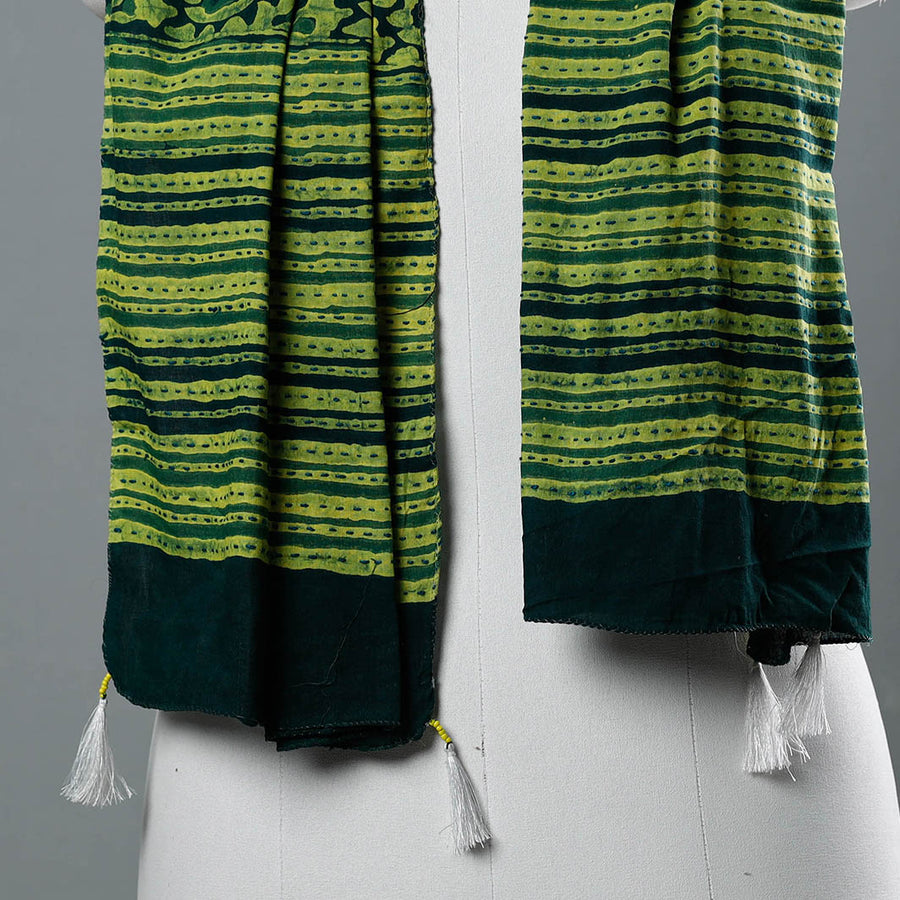 Fine quality bagru hand block printed tagai work pure cotton stole with tassels, made using natural dyes through traditional mud resist process by using hand carved wooden block practiced in Bagru, Rajasthan. These stoles are designed with running patterns & has been hand embroidered using traditional craft technique of Tagai.