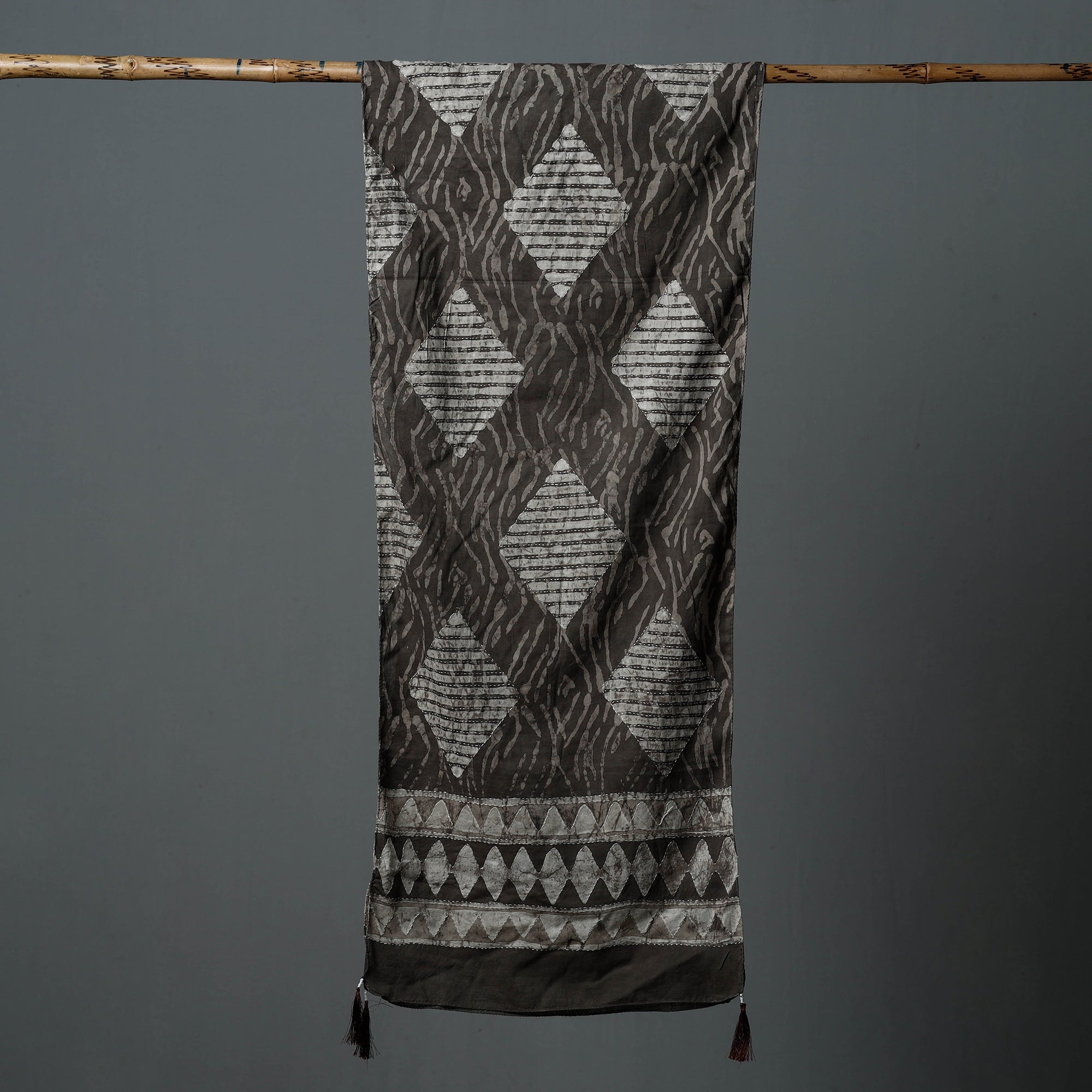 Fine quality bagru hand block printed tagai work pure cotton stole with tassels, made using natural dyes through traditional mud resist process by using hand carved wooden block practiced in Bagru, Rajasthan. These stoles are designed with running patterns & has been hand embroidered using traditional craft technique of Tagai.