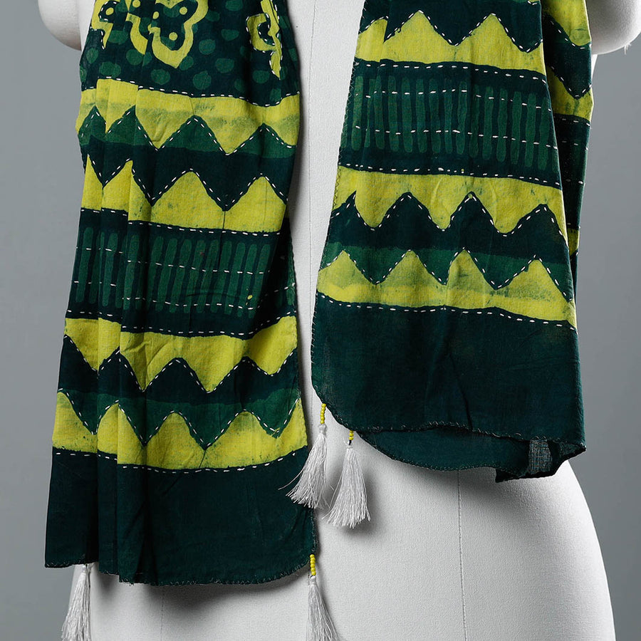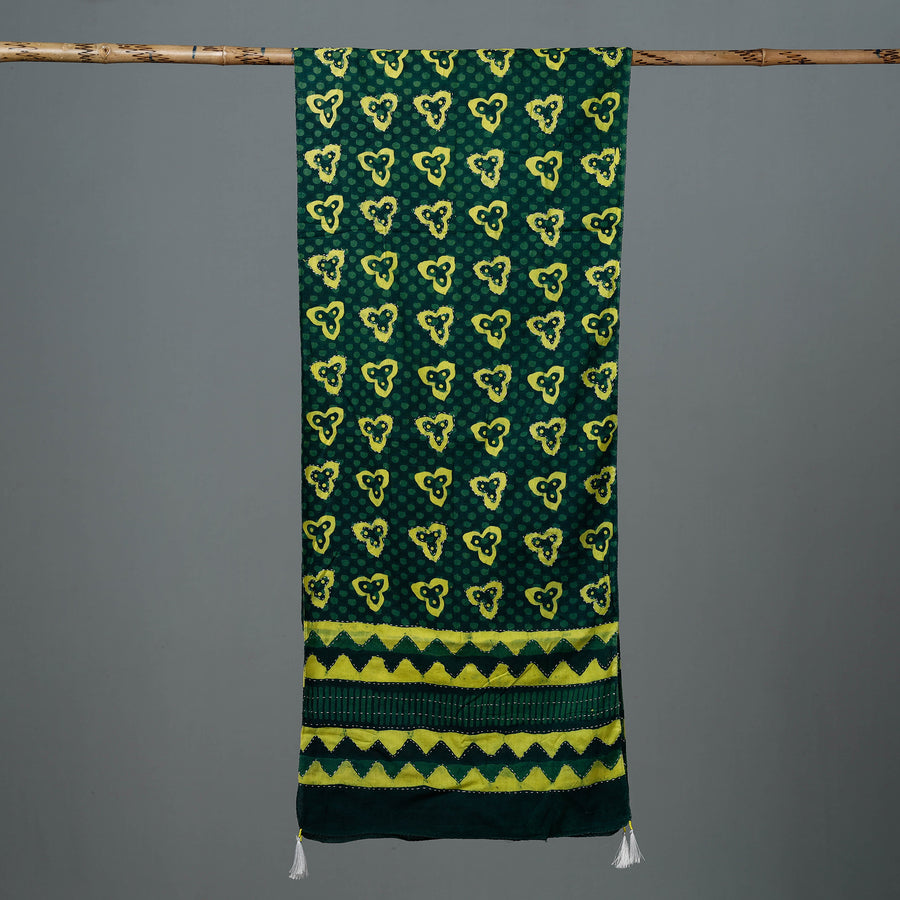 Fine quality bagru hand block printed tagai work pure cotton stole with tassels, made using natural dyes through traditional mud resist process by using hand carved wooden block practiced in Bagru, Rajasthan. These stoles are designed with running patterns & has been hand embroidered using traditional craft technique of Tagai.