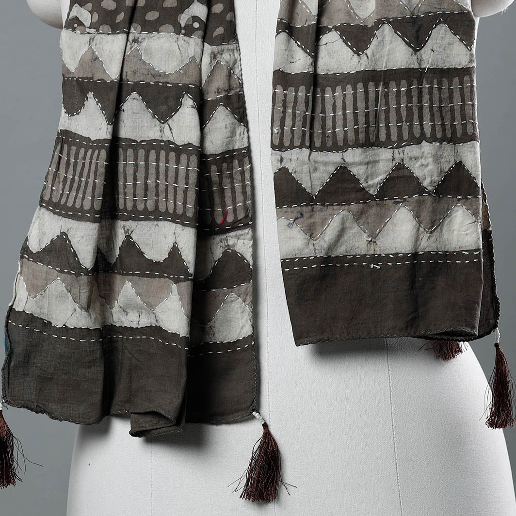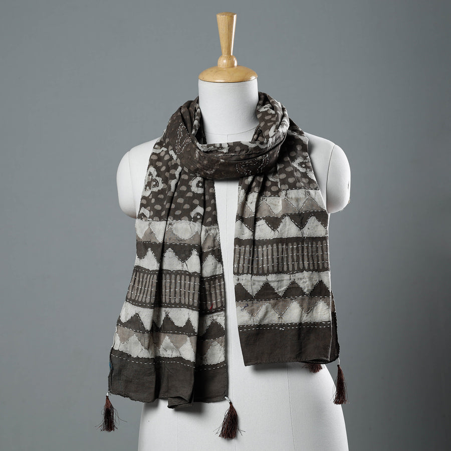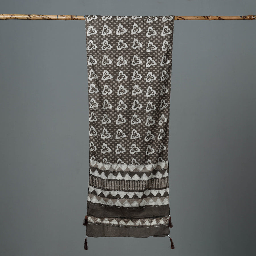 Fine quality bagru hand block printed tagai work pure cotton stole with tassels, made using natural dyes through traditional mud resist process by using hand carved wooden block practiced in Bagru, Rajasthan. These stoles are designed with running patterns & has been hand embroidered using traditional craft technique of Tagai.