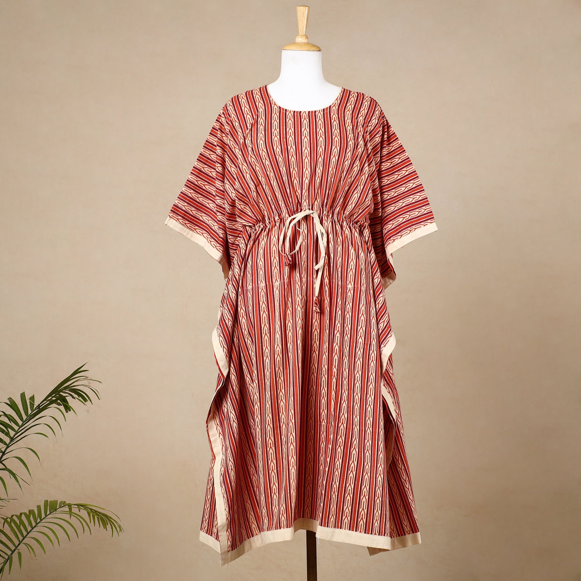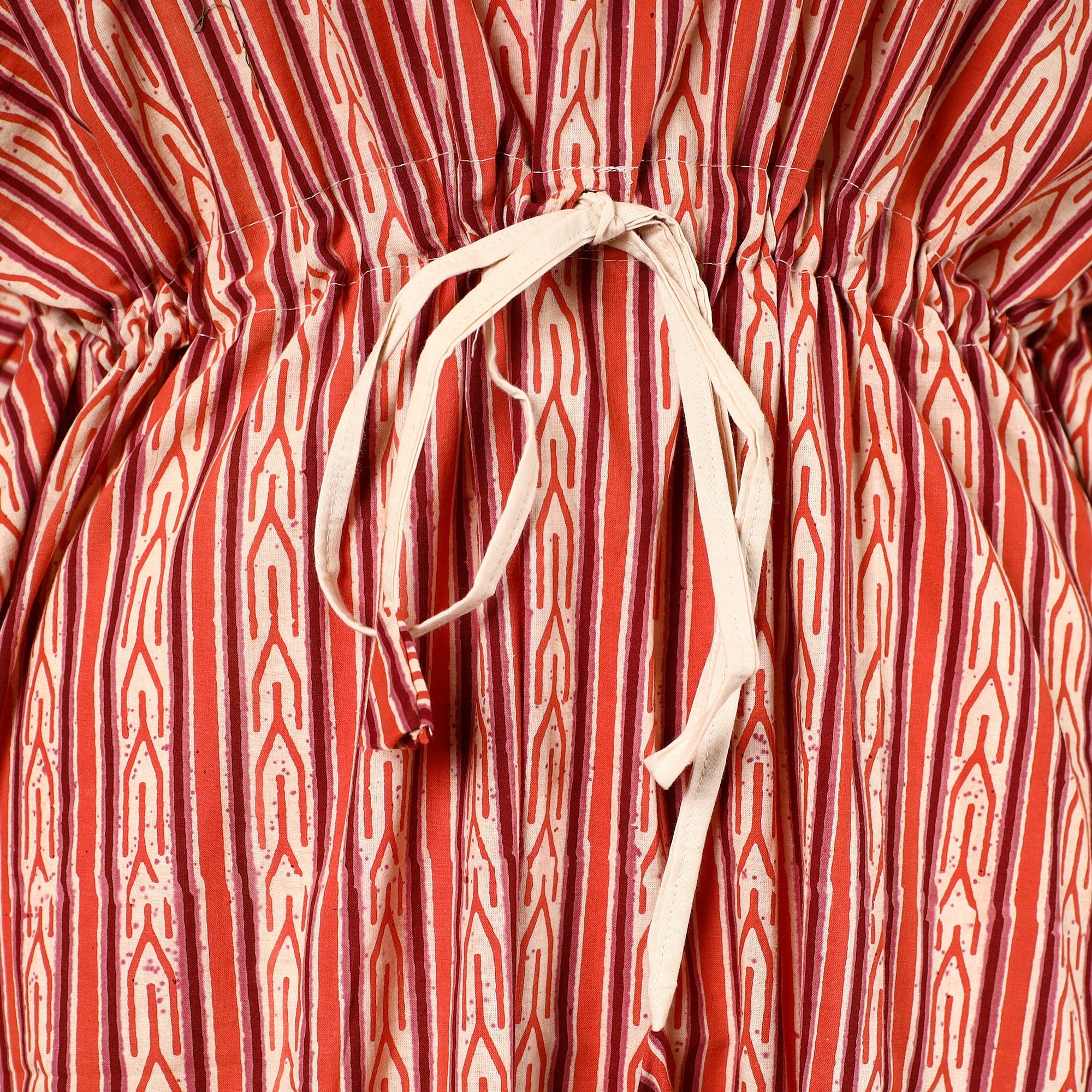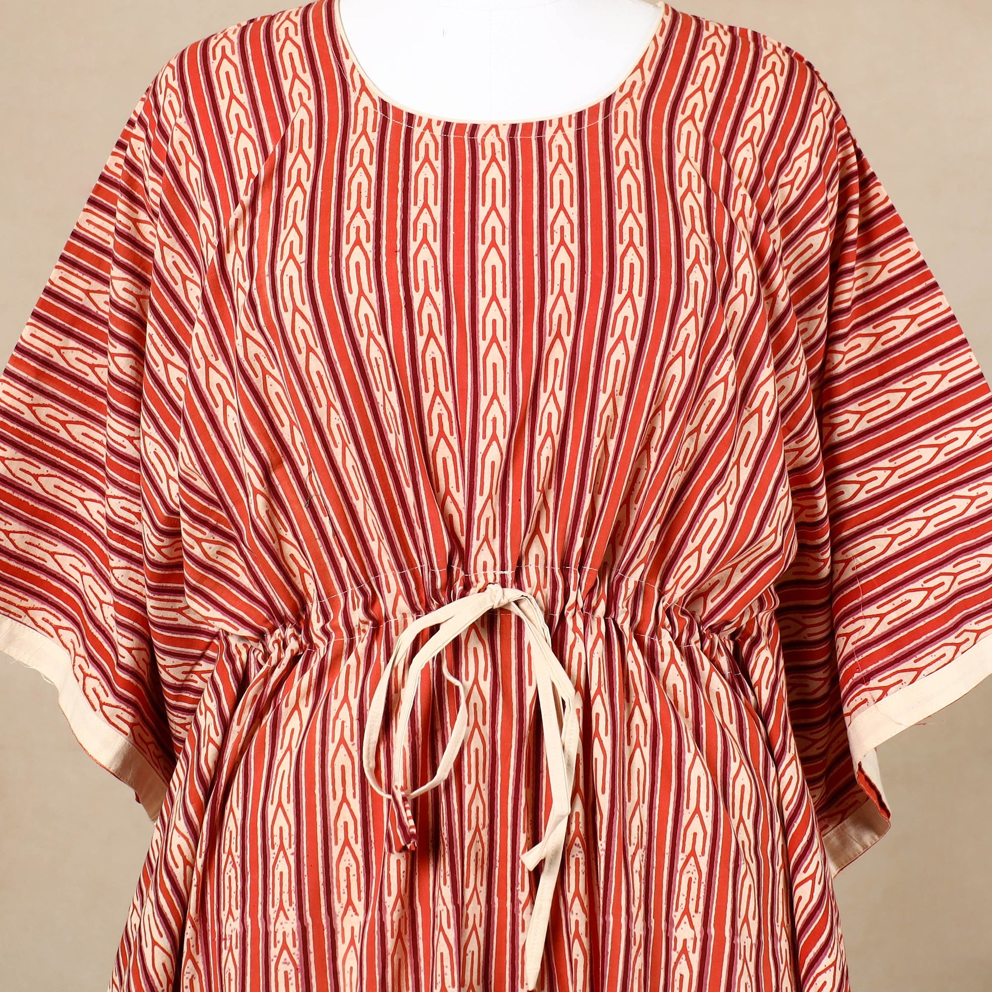 | Material | Fine quality hand block printed cotton kaftan with tie-up waist. A traditional kaftan or caftan is an ankle-length garment with long, flowing sleeves. It has an adjustable drawstring waist. These loose-fitting cotton kaftans are enhanced by a soft touch and beautiful hand prints. This dress will allow you to move with ease and comfort. The drawstring waist tie will give you the freedom to customize the fit to suit your unique shape. |