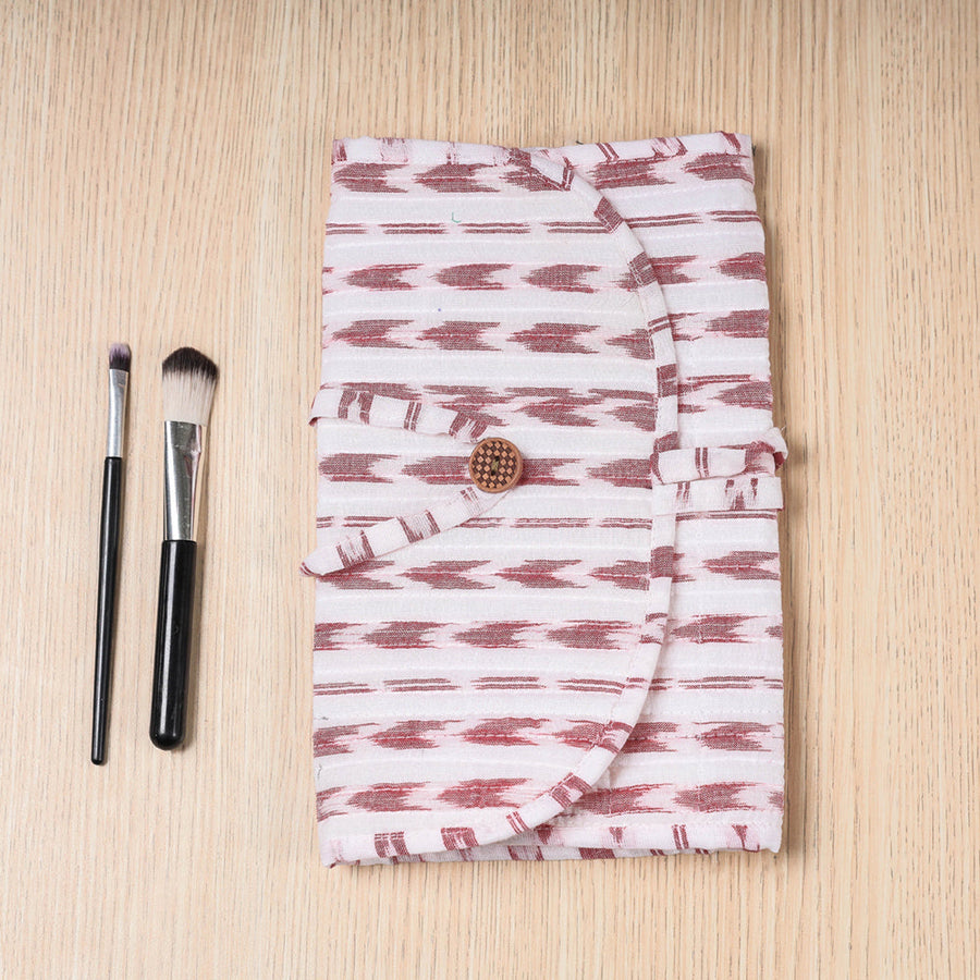 Handcrafted multipurpose segmented Make-up Brush Wrap Pouch / storage organizer made from ikat cotton fabrics & foam, textured with handmade textiles of India. It has one big & four small pockets. You can securely store makeup brushes, paint brushes, scattered wrenches, screwdrivers, scissors, and other chef utensils or other hand tools.
