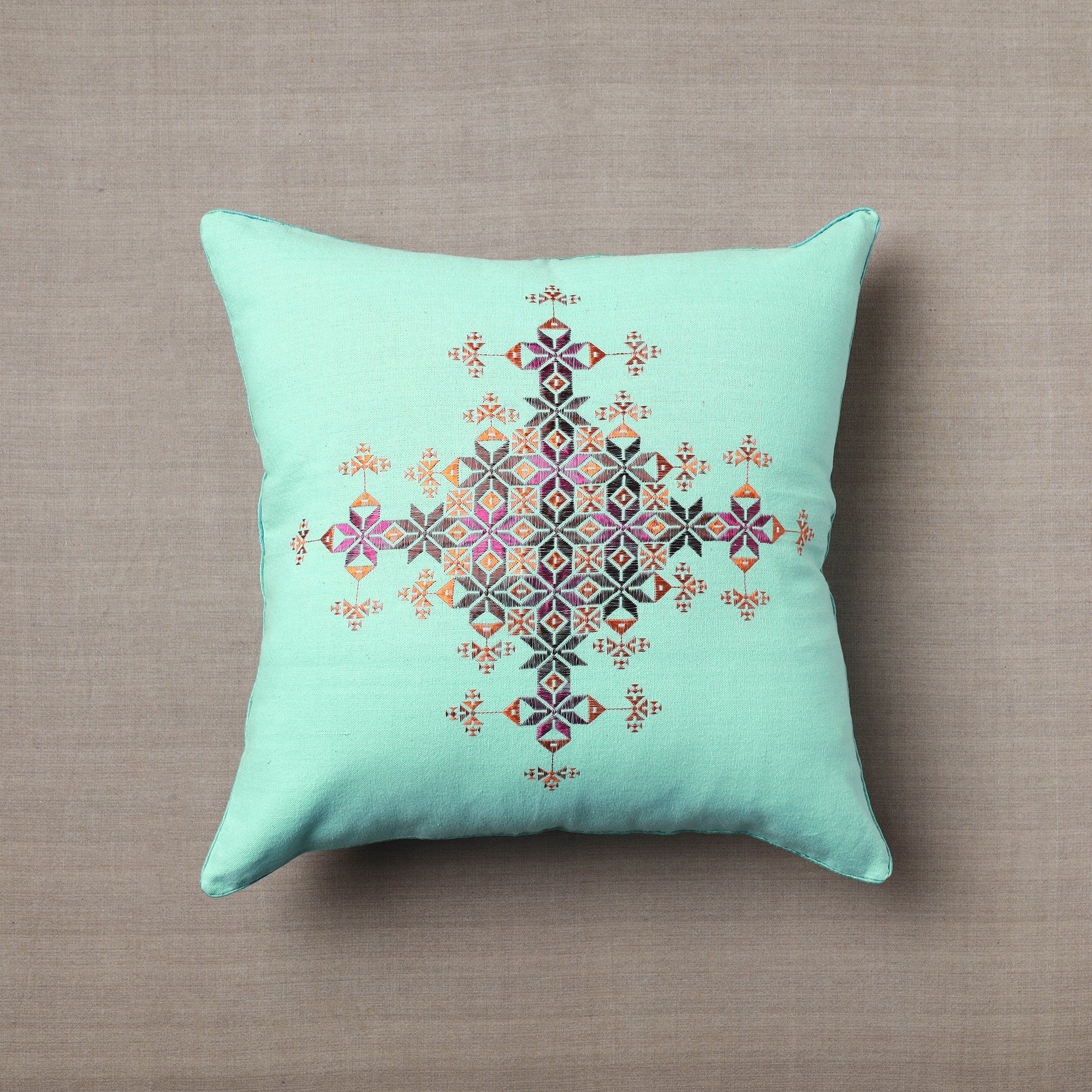 Fine quality soof stitch embroidery pure handloom cotton cushion cover.