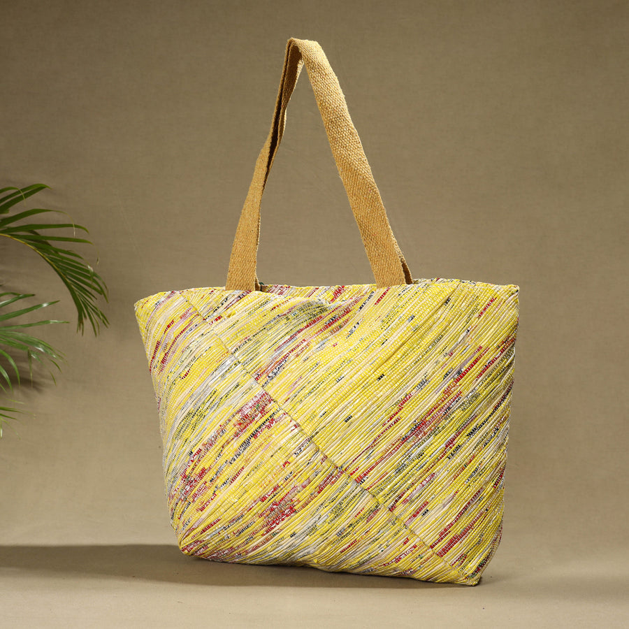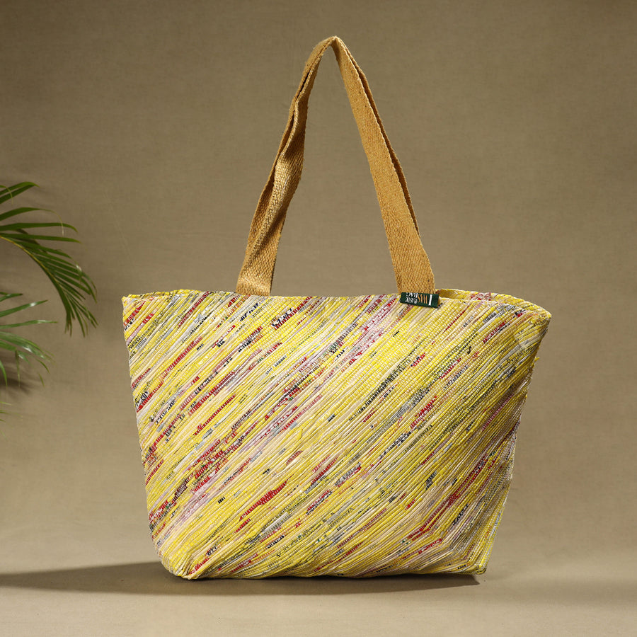 Yellow upcycled plastic weave handcrafted shoulder bag by Ecokaari. It has two simple, one zipper pocket & one key holder inside. It is generously sized to hold a 14" laptop, wallet, makeup bag, a change of shoes and more, making it the perfect choice to carry your essentials for everyday or overnight use. This is the answer to an effortless everyday bag. Our unique process of Upcycling uses a traditional Charkha & Handloom to weave a fabric from all the waste plastic that we've gathered. At first we collect waste plastic bags sanitize & sundried them. Then master artisans of Ecokaari manually cut plastic bags into strips. Then rolled on a traditional Charkha and woven into a fabric on a handloom. After woven into fabric it stitched in required designs to make products.