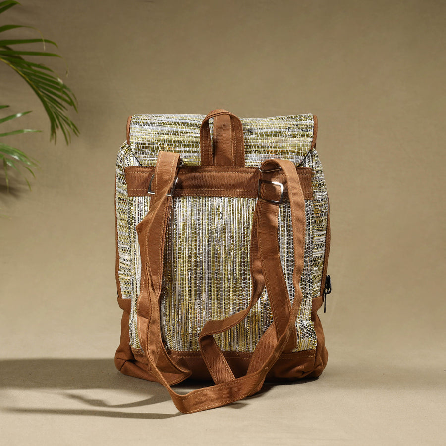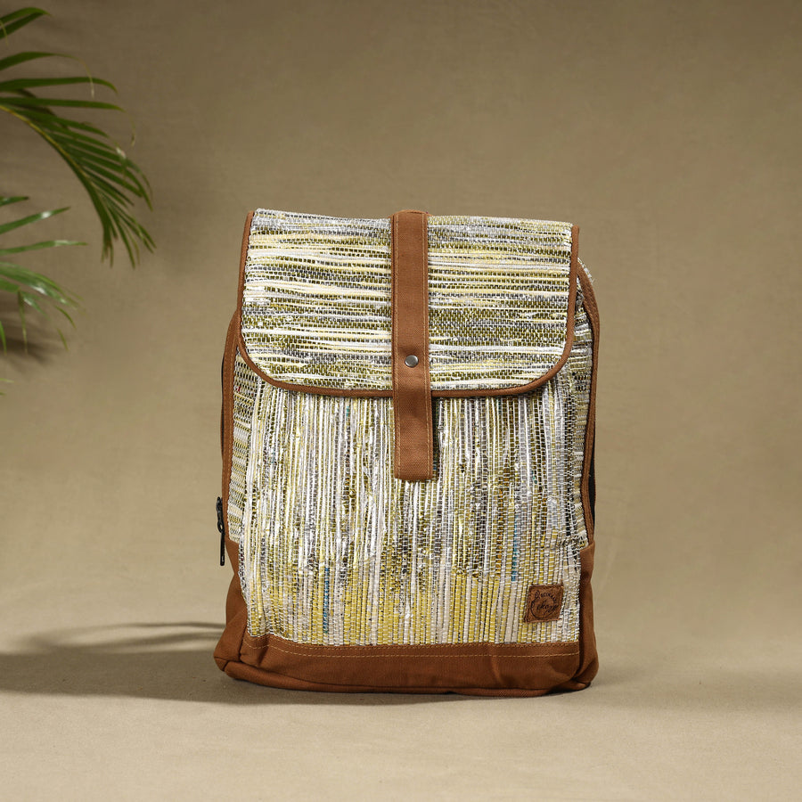 Yellow upcycled plastic weave handcrafted mini backpack by Ecokaari. It has one simple & one zipper pocket with key holder inside. This mini backpack can also be used as a crossbody bog. It will take you from your daily commute to weekend adventures in style. It is generously sized to hold a water bottle, clutch, other essentials like books, stationery and more making it the perfect choice to carry for everyday use. Choose what fits you right! Our unique process of Upcycling uses a traditional Charkha & Handloom to weave a fabric from all the waste plastic that we've gathered. At first we collect waste plastic bags sanitize & sundried them. Then master artisans of Ecokaari manually cut plastic bags into strips. Then rolled on a traditional Charkha and woven into a fabric on a handloom. After woven into fabric it stitched in required designs to make products.