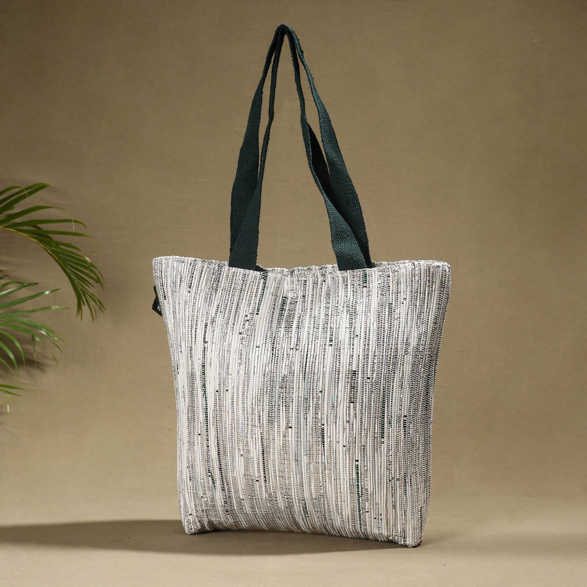 Grey upcycled plastic weave handcrafted shoulder bag by Ecokaari. It has two simple, one zipper pocket & one key holder inside. It is generously sized to hold a 14" laptop, wallet, makeup bag, a change of shoes and more, making it the perfect choice to carry your essentials for everyday or overnight use. This is the answer to an effortless everyday bag. Our unique process of Upcycling uses a traditional Charkha & Handloom to weave a fabric from all the waste plastic that we've gathered. At first we collect waste plastic bags sanitize & sundried them. Then master artisans of Ecokaari manually cut plastic bags into strips. Then rolled on a traditional Charkha and woven into a fabric on a handloom. After woven into fabric it stitched in required designs to make products.
