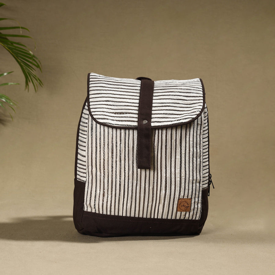 White upcycled plastic weave handcrafted mini backpack by Ecokaari. It has one simple & one zipper pocket with key holder inside. This mini backpack can also be used as a crossbody bog. It will take you from your daily commute to weekend adventures in style. It is generously sized to hold a water bottle, clutch, other essentials like books, stationery and more making it the perfect choice to carry for everyday use. Choose what fits you right! Our unique process of Upcycling uses a traditional Charkha & Handloom to weave a fabric from all the waste plastic that we've gathered. At first we collect waste plastic bags sanitize & sundried them. Then master artisans of Ecokaari manually cut plastic bags into strips. Then rolled on a traditional Charkha and woven into a fabric on a handloom. After woven into fabric it stitched in required designs to make products.