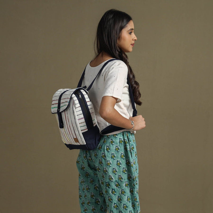White upcycled plastic weave handcrafted mini backpack by Ecokaari. It has one simple & one zipper pocket with key holder inside. This mini backpack can also be used as a crossbody bog. It will take you from your daily commute to weekend adventures in style. It is generously sized to hold a water bottle, clutch, other essentials like books, stationery and more making it the perfect choice to carry for everyday use. Choose what fits you right! Our unique process of Upcycling uses a traditional Charkha & Handloom to weave a fabric from all the waste plastic that we've gathered. At first we collect waste plastic bags sanitize & sundried them. Then master artisans of Ecokaari manually cut plastic bags into strips. Then rolled on a traditional Charkha and woven into a fabric on a handloom. After woven into fabric it stitched in required designs to make products.