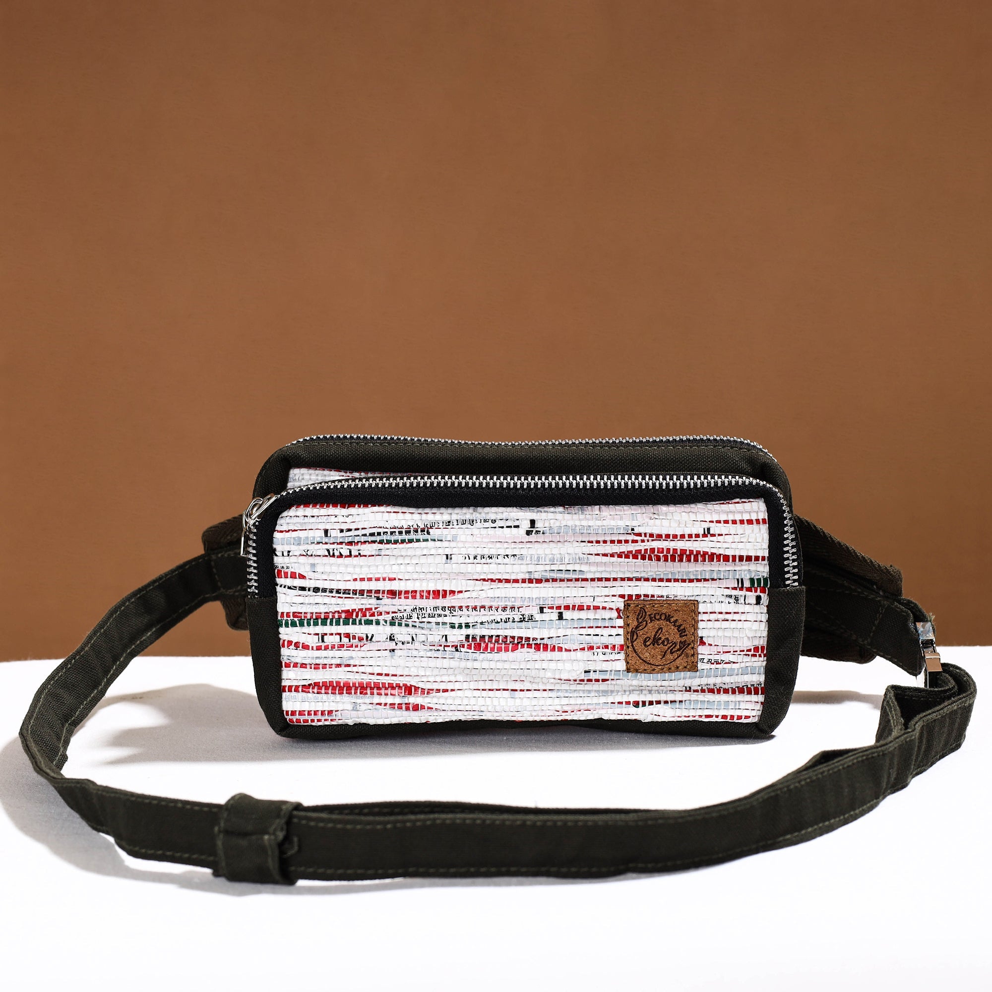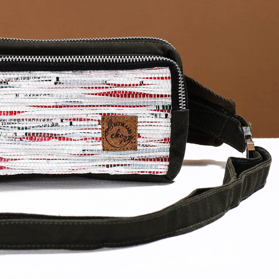 Upcycled plastic weave handmade fanny pack/ waist bag by Ecokaari. It has two compartments & one zipper pocket inside. This Fanny Pack is sleek, roomy belt bag that can be worn crossbody or around your waist. It’s comfortable, adjustable, fits your daily carry from wallets to keys to phones, and even a 35mm camera and can be adjusted just as you please! Our unique process of Upcycling uses a traditional Charkha & Handloom to weave a fabric from all the waste plastic that we've gathered. At first we collect waste plastic bags sanitize & sundried them. Then master artisans of Ecokaari manually cut plastic bags into strips. Then rolled on a traditional Charkha and woven into a fabric on a handloom. After woven into fabric it stitched in required designs to make products.