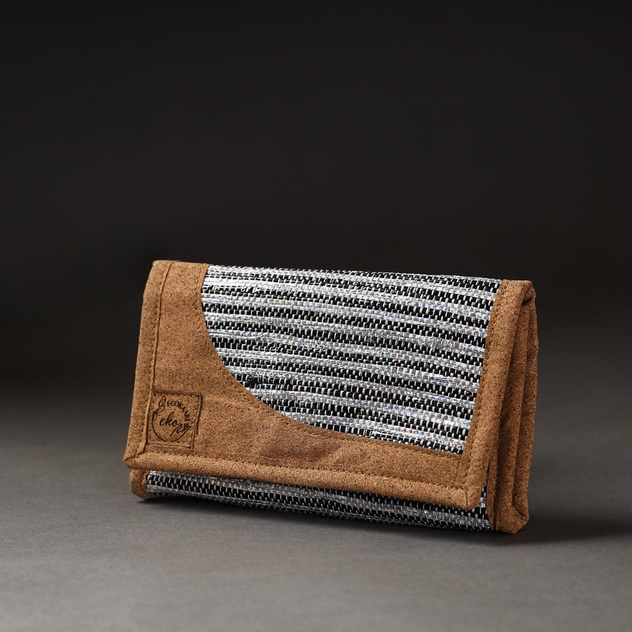 Upcycled plastic weave handcrafted black clutch by Ecokaari. It has two partitions, one zipper pocket & five card slots inside. The clutch offers all the space and convenience you need! It comes with a functional design that offers separate sections inside for easier access; designed with several slots for the safe upkeep of your cards and cash in an orderly manner so you can finally stop fumbling inside that big bag. It is a perfect clutch that embodies style and grace while embracing the natural resources we’re blessed with. Our unique process of Upcycling uses a traditional Charkha & Handloom to weave a fabric from all the waste plastic that we've gathered. At first we collect waste plastic bags sanitize & sundried them. Then master artisans of Ecokaari manually cut plastic bags into strips. Then rolled on a traditional Charkha and woven into a fabric on a handloom. After woven into fabric it stitched in required designs to make products.