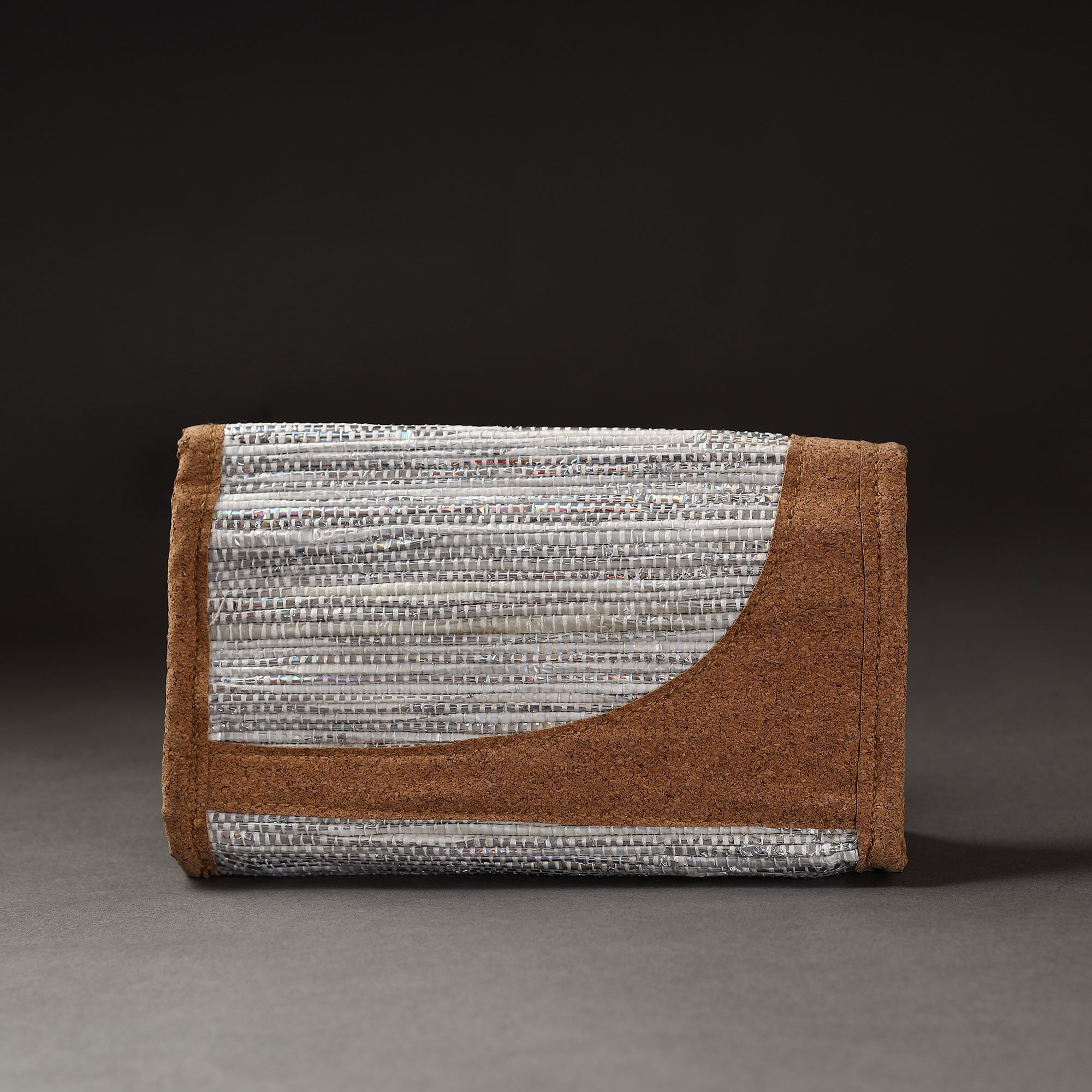 Upcycled plastic weave handcrafted white clutch by Ecokaari. It has two partitions, one zipper pocket & five card slots inside. The clutch offers all the space and convenience you need! It comes with a functional design that offers separate sections inside for easier access; designed with several slots for the safe upkeep of your cards and cash in an orderly manner so you can finally stop fumbling inside that big bag. It is a perfect clutch that embodies style and grace while embracing the natural resources we’re blessed with. Our unique process of Upcycling uses a traditional Charkha & Handloom to weave a fabric from all the waste plastic that we've gathered. At first we collect waste plastic bags sanitize & sundried them. Then master artisans of Ecokaari manually cut plastic bags into strips. Then rolled on a traditional Charkha and woven into a fabric on a handloom. After woven into fabric it stitched in required designs to make products.