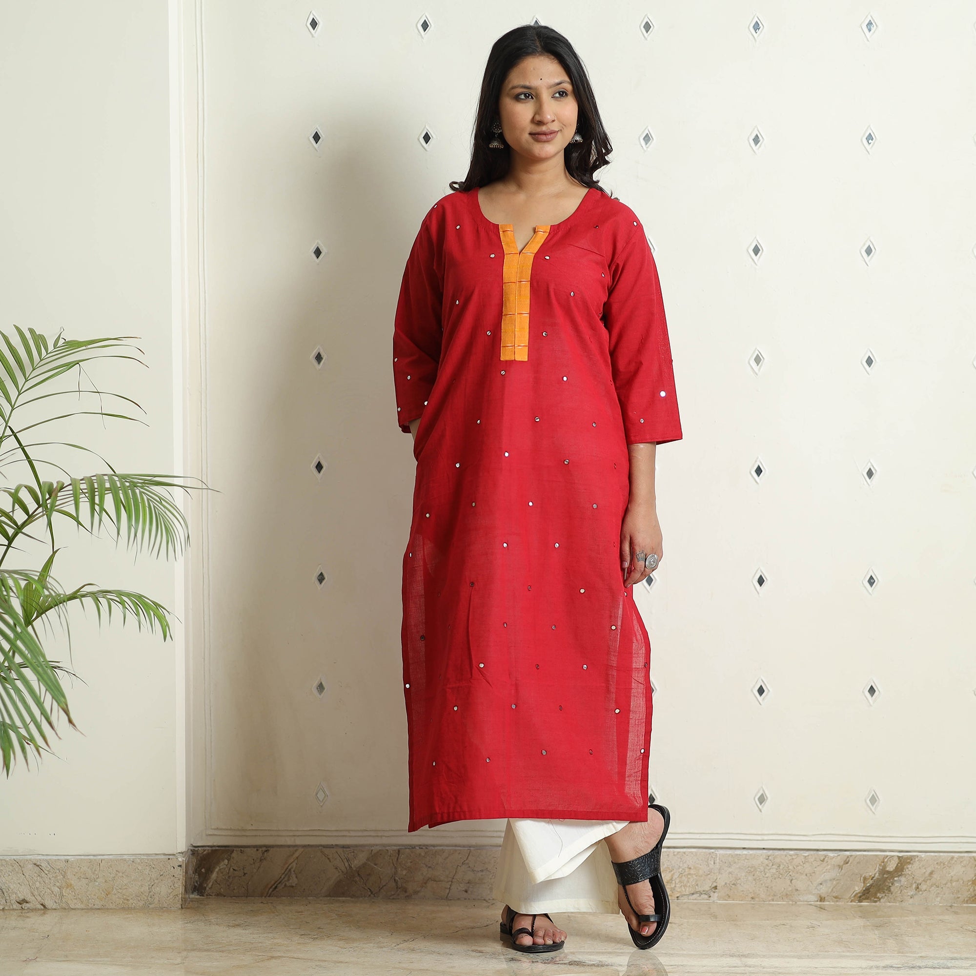 Fine quality original mangalagiri pure handloom cotton mirror (sequin) work long kurta with side pocket. The handloom experience (soft, comfortable and durable) is due to the human handling of the yarn in the weaving process. As a result, yarn and the fabric are much less stressed and damaged. Hand woven cotton is known for its breathability as compared to mill made cotton. This implies that it allows more air penetration making it cooler, softer and more absorbent. It keeps you cooler in summers and warm in winters.