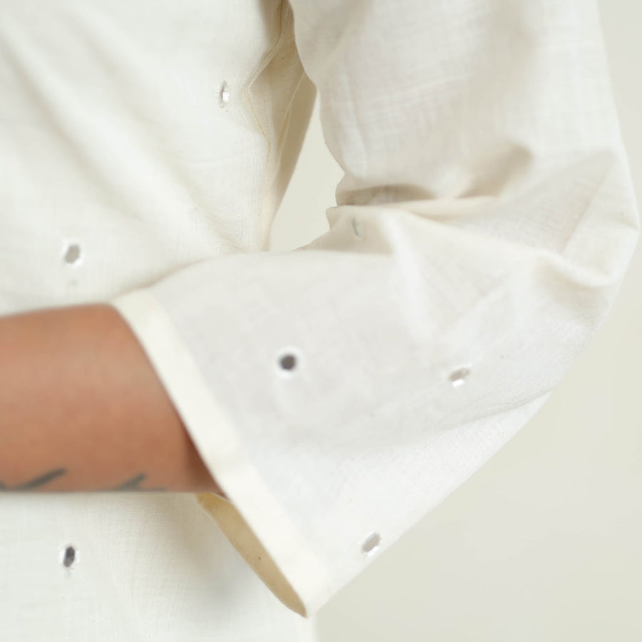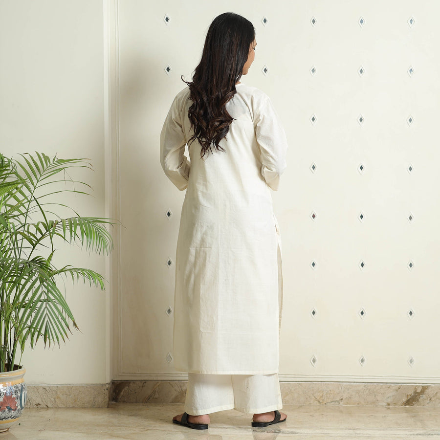 Fine quality original mangalgiri pure handloom cotton mirror (sequin) work long kurta with side pocket. The handloom experience (soft, comfortable and durable) is due to the human handling of the yarn in the weaving process. As a result, yarn and the fabric are much less stressed and damaged. Hand woven cotton is known for its breathability as compared to mill made cotton. This implies that it allows more air penetration making it cooler, softer and more absorbent. It keeps you cooler in summers and warm in winters.