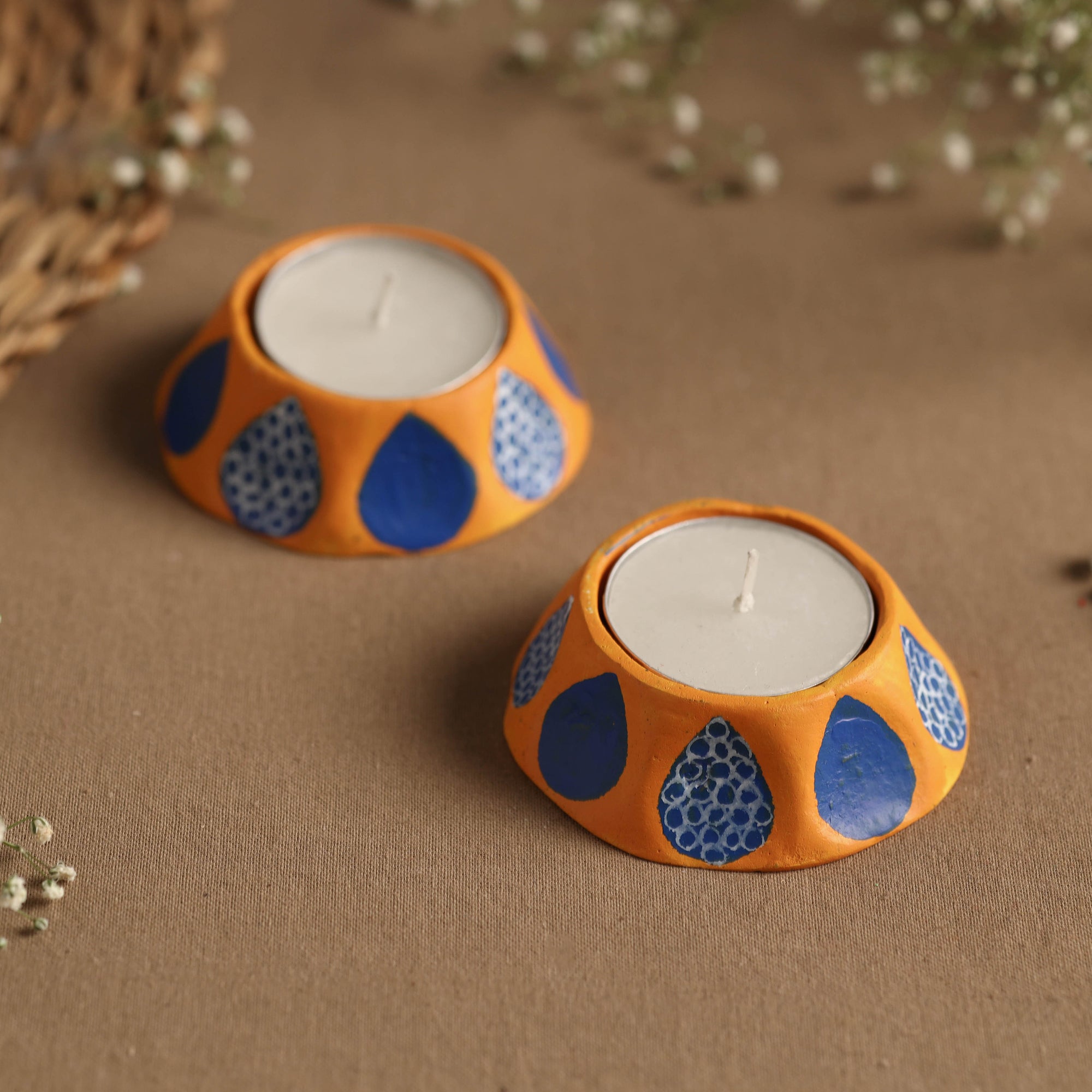 Handpainted clay (fire clay) candle holders (set of 2). Bring an earthy touch & some elegant hues with this incredible hand painted clay candle holders. This handcrafted candle holders will be spectacular as Diwali decor to be placed anywhere in the house. It's contrast coloring accentuates the beauty of your home.