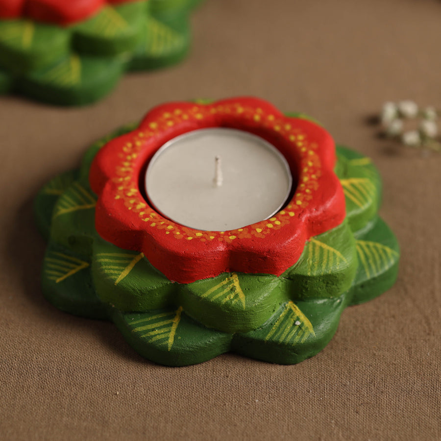 Handpainted clay (fire clay) candle holders (set of 2). Bring an earthy touch & some elegant hues with this incredible hand painted clay candle holders. This handcrafted candle holders will be spectacular as Diwali decor to be placed anywhere in the house. It's contrast coloring accentuates the beauty of your home.