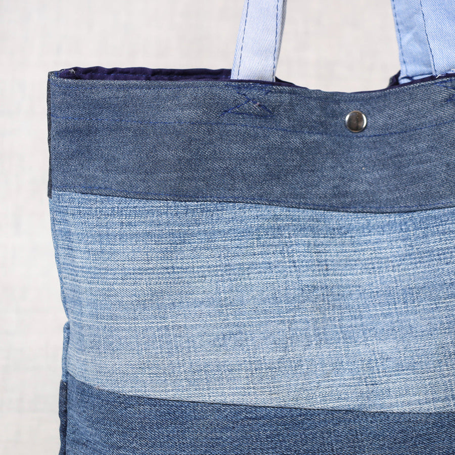 Blue handcrafted upcycled denim hand bag. Ample space to keep most of your essentials. Step out in style with this denim bag. Its color combination and comfortability makes you go effortlessly. Team it with your everyday casuals and matching footwear to complete the look.