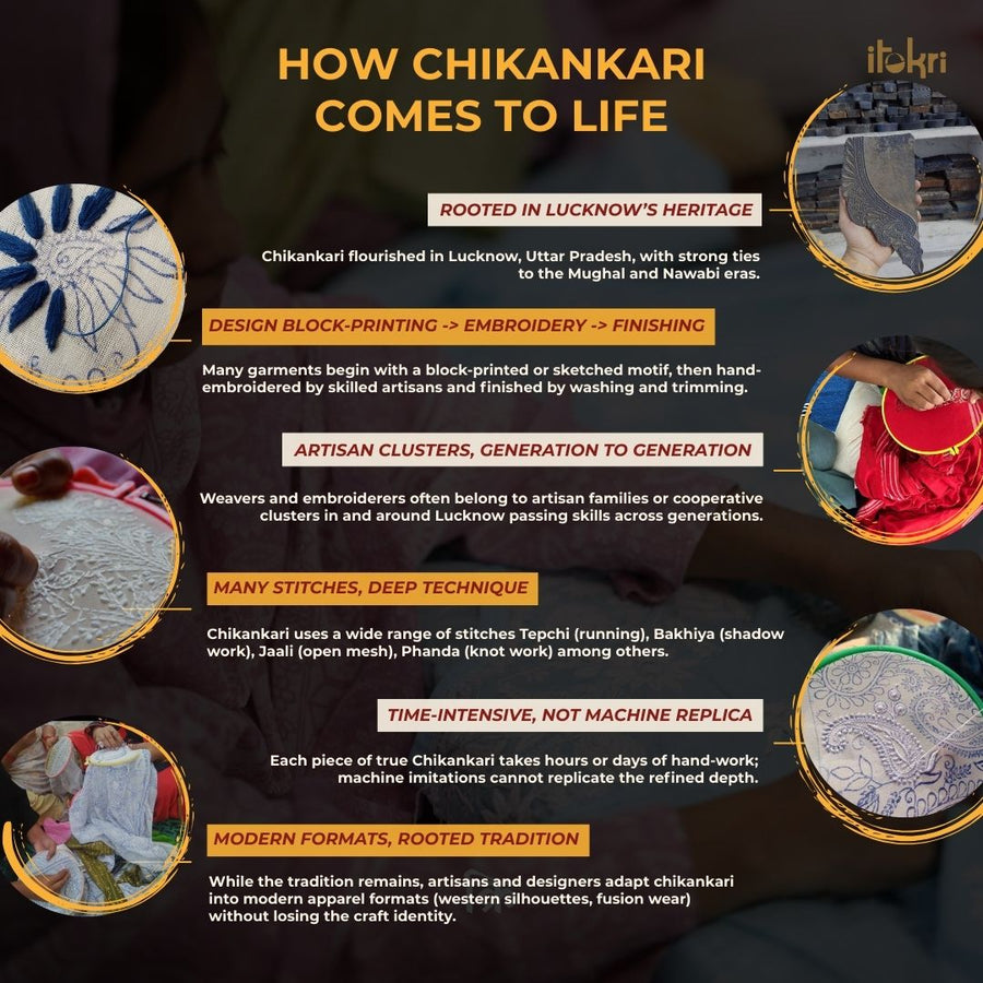 Chikankari is a popular embroidery work done with the help of a white cotton thread on fine white cotton material. It is also known as shadow work. Chikan is an extremely delicate and artfully done hand embroidery on fabrics like muslin, silk, chiffon, organza, net, etc