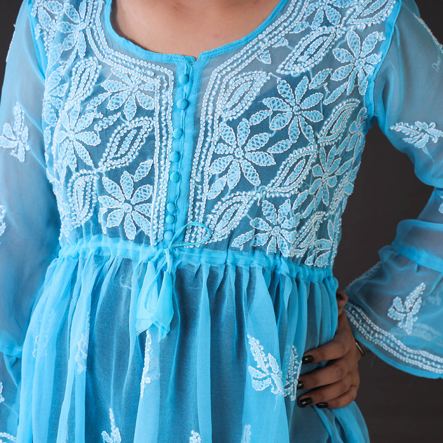 Intricate and artfully done lucknow chikankari hand embroidered sheer short flared kurta / top. Chikankari is a traditional textile from Lucknow. It is very delicate and intricate hand embroidery work where thread is embroidered on cool, pastel shades of light cotton garments.